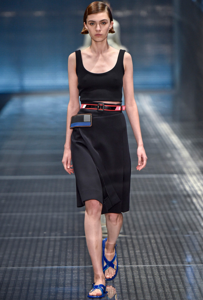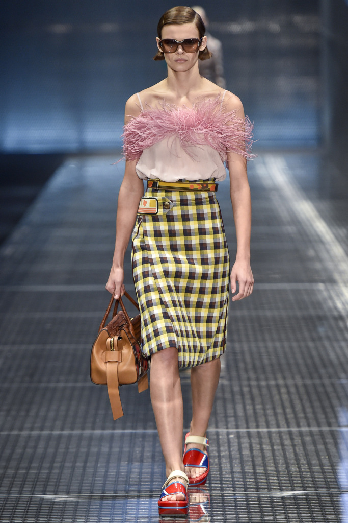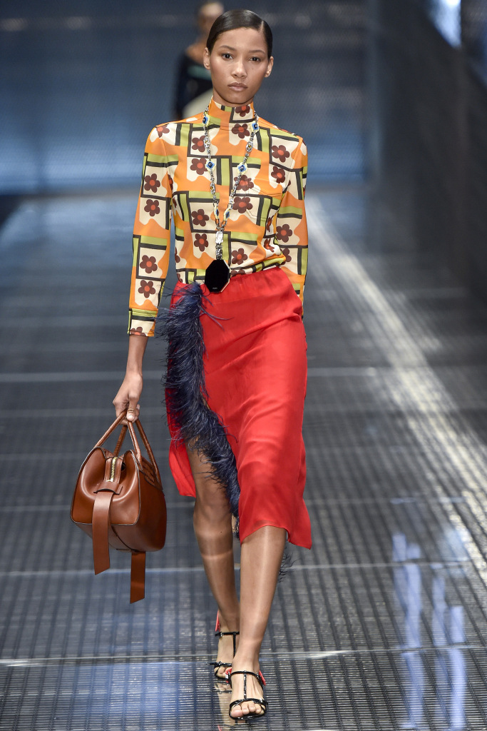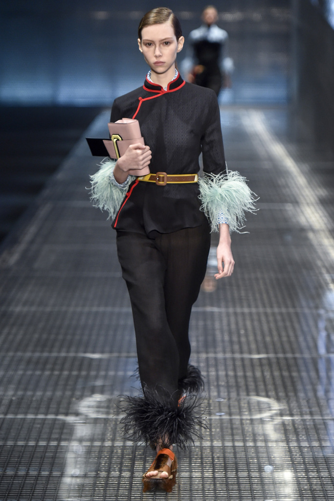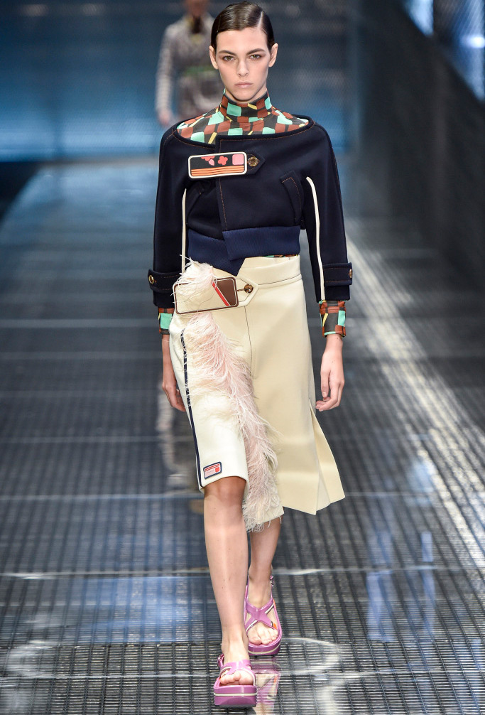 Dans la collection printemps-été 2026 de Prada, le décor le plus marquant est celui des plumes de marabout. Accessoires, manchettes, jupes et même sandales sont ornés de plumes. En second lieu, vous pouvez mettre de l'asymétrie, dans la collection il y a beaucoup de jupes portefeuille asymétriques originales qui sont combinées avec des cols roulés en maille fine, des chemises et des pulls.