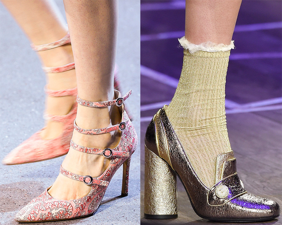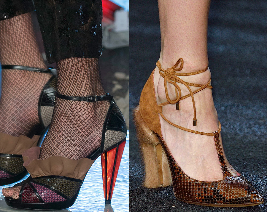 Comme toujours, les designers accordent une grande attention aux talons et à la forme des orteils. Les talons sont même un élément décoratif à part entière.De tout ce qui suit, vous pouvez voir que les talons bas et hauts sur le podium ne sont pas inférieurs les uns aux autres, vous pouvez donc devenir à la fois plus haut et plus bas en toute sécurité. Mais la forme non standard des talons est moins courante, et ce n'est pas si non standard, les concepteurs ont juste un peu fantasmé.