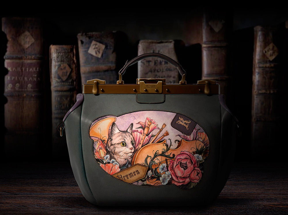 Dans cette collection, chacun trouvera un sac à son goût. Les fans de tout lumineux et coloré choisiront le sac n°47 "Alice" rempli de bouquets de fleurs luxuriants ou le sac et la pochette "Bremen Town Musicians".