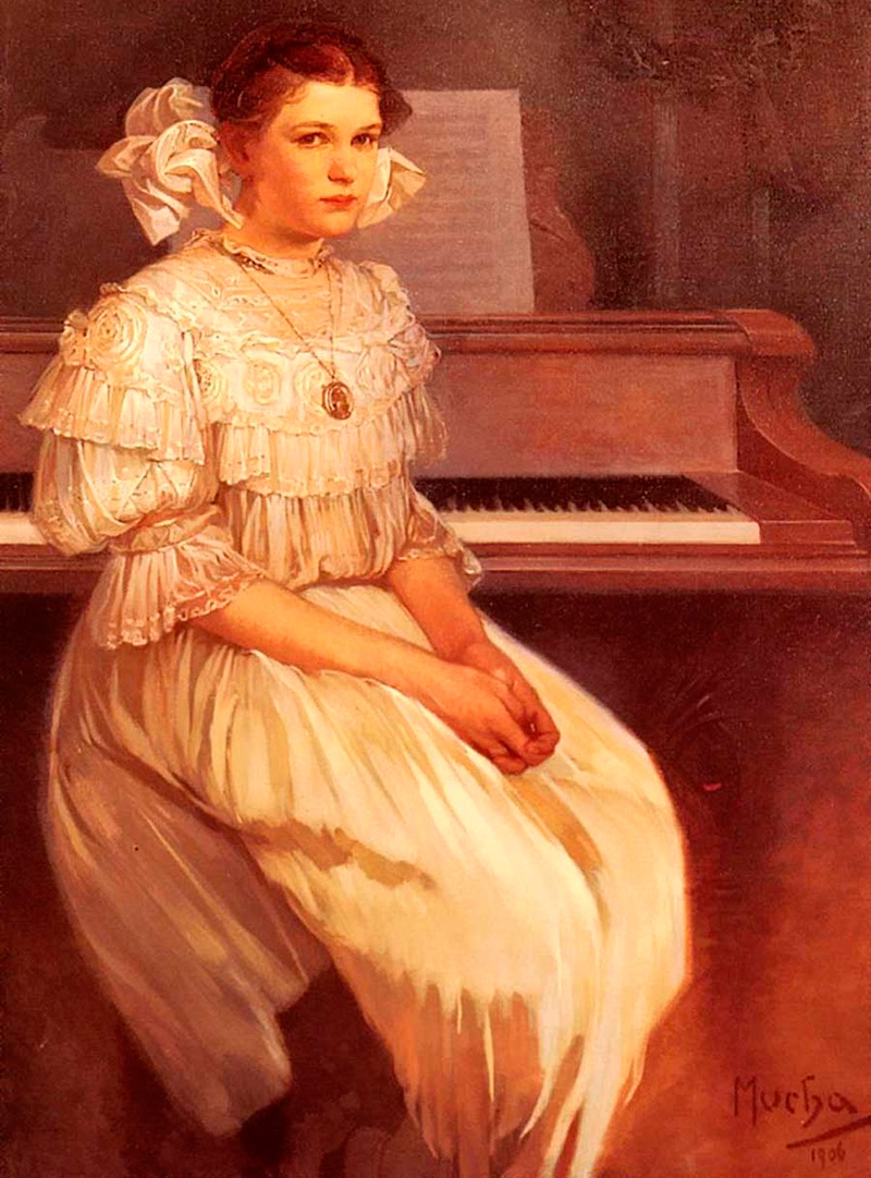 Maria avait 22 ans de moins que l'artiste et lui a survécu à peu près autant. Dans ses sentiments pour l'artiste, il n'y avait aucun calcul matériel, car au moment de leur mariage, les dettes d'Alphonse Mucha dépassaient de loin son état.