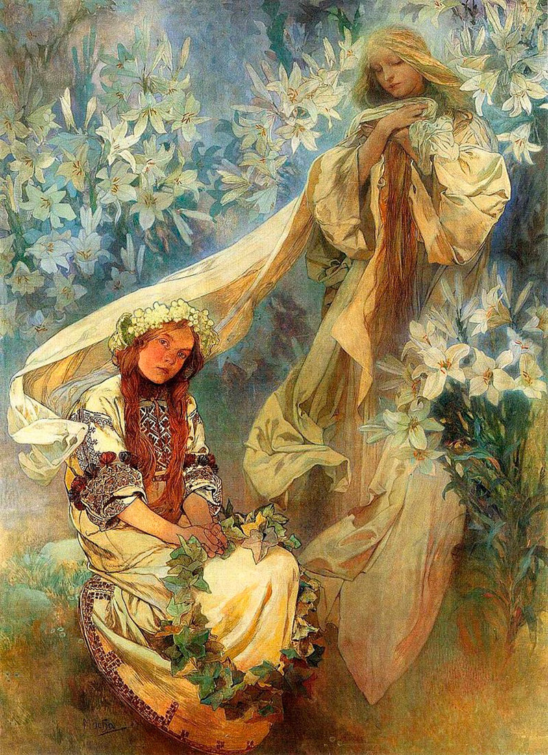 Les peintures d'Alphonse Mucha sont encadrées de motifs floraux complexes qui ne cachent pas leurs origines byzantines ou orientales. Contrairement aux peintures inquiétantes des maîtres contemporains - Klimt, Vrubel, Bakst - les œuvres d'Alphonse Mucha respirent le calme et la félicité. Le style Art Nouveau dans l'œuvre de Mucha est le style des femmes et des fleurs.