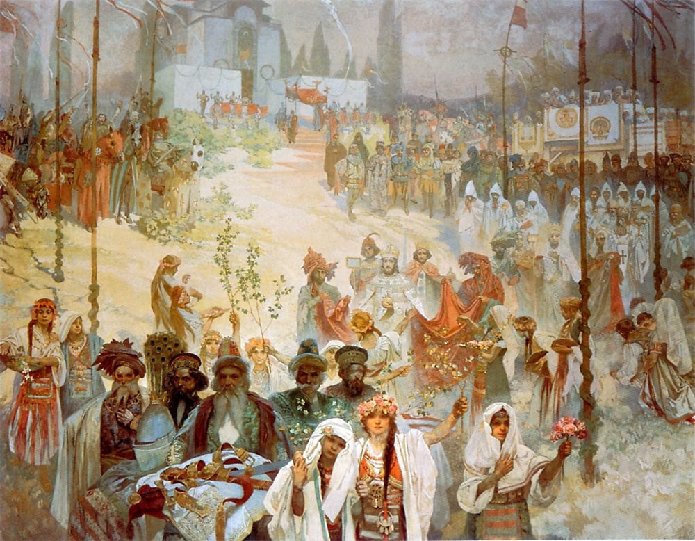 Malgré ses succès créatifs et financiers aux États-Unis, la vie américaine pesant sur Mucha avec pour seul objectif l'argent, il rêvait de retourner en République tchèque. En 1910, il retourne à Prague et concentre toutes ses énergies sur "l'épopée slave". Ce cycle monumental a été offert par lui au peuple tchèque et à la ville de Prague, mais n'a pas eu de succès auprès des critiques d'art.
