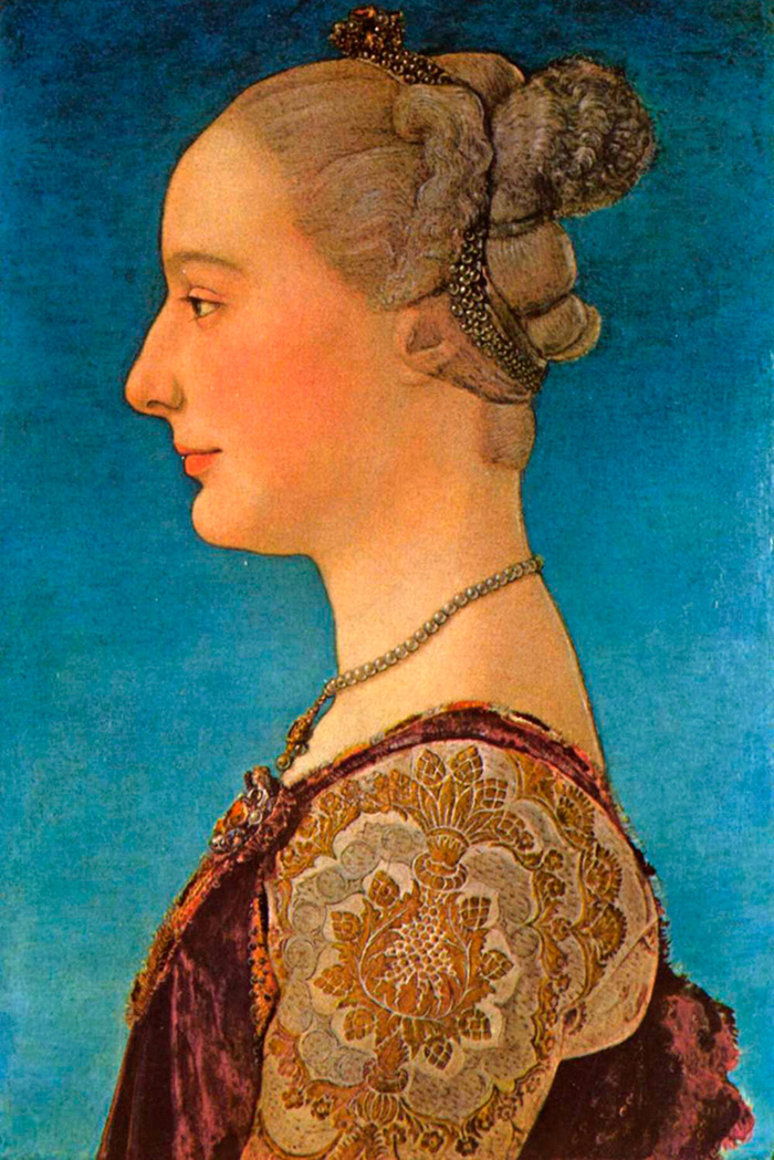 Pendant la Renaissance en Italie, les femmes étaient considérées comme belles avec un long cou et un front haut. Les femmes encore, comme au Moyen Âge, pour souligner la hauteur du front, rasaient les cheveux au-dessus du front à l'épaisseur de deux doigts. Sourcils et cils non teints. Mais le parfum était utilisé en grande quantité. Ils ont rougi les joues, peint les lèvres.