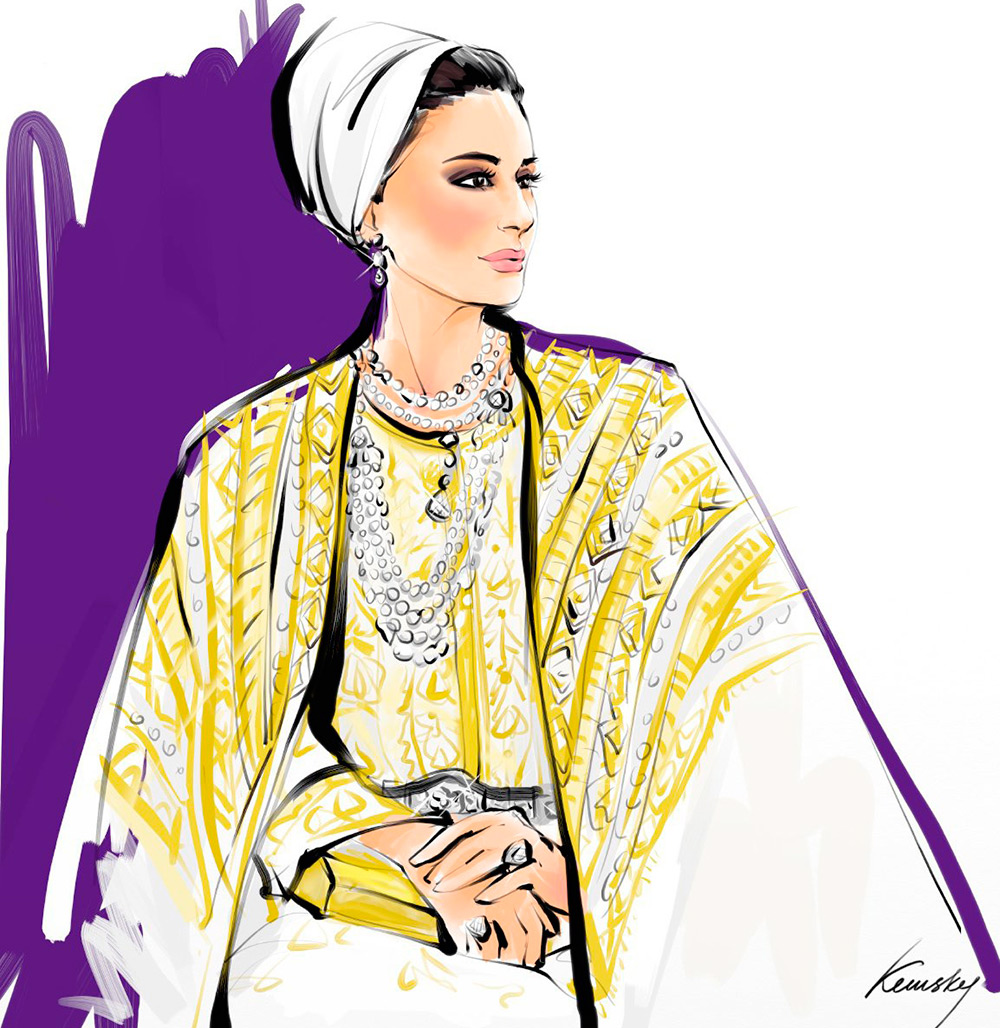 Cheikha Mozah bint Nasser al-Misned admire de nombreuses fashionistas avec sa beauté et son style. Pour certains, elle devient un modèle et une source d'inspiration. Par conséquent, nous pouvons voir non seulement des photographies, mais aussi des illustrations de mode.