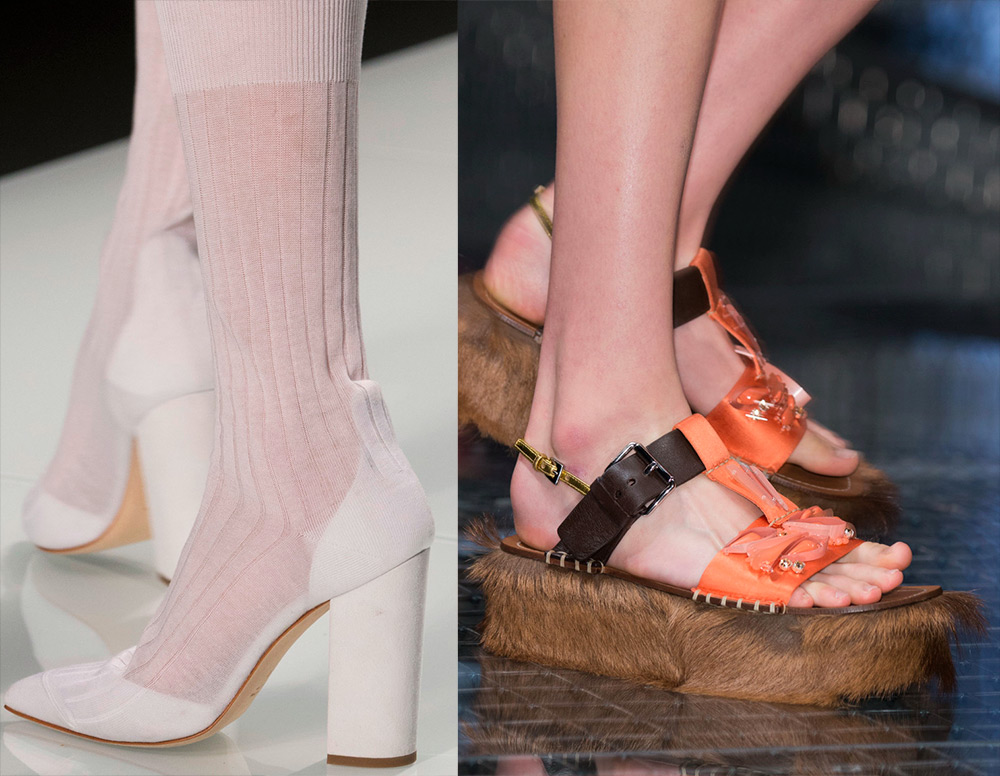Malgré la supposée chaleur du printemps, les bottes à plateforme haute, comme Gareth Pugh, ou à semelles de tracteur épaisses, comme Versus, ne feront pas mal du tout, mais au contraire, créeront un look chic pour de nombreuses fashionistas de style militaire ou grunge. .