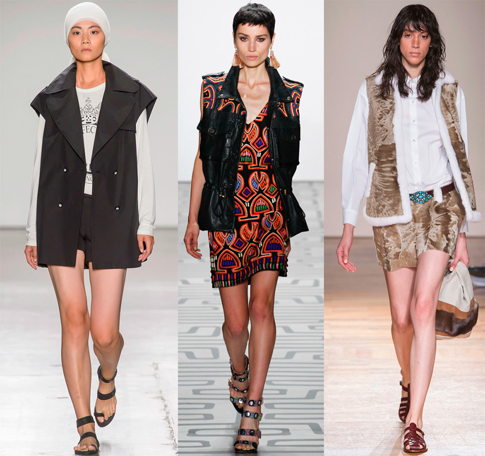 Vionnet, GiambaZang Toi propose une veste sans manches allongée dans une couleur noire stricte. Et la créatrice Nicole Miller enfile une veste sans manches en version combinée sur une robe lumineuse. Simonetta Ravizza, passionnée de fourrure, assure qu'une veste sans manches en fourrure est très appropriée lors des fraîches journées de printemps.