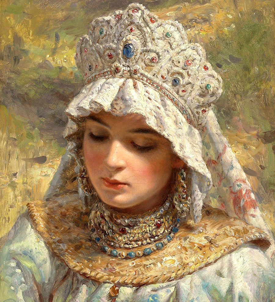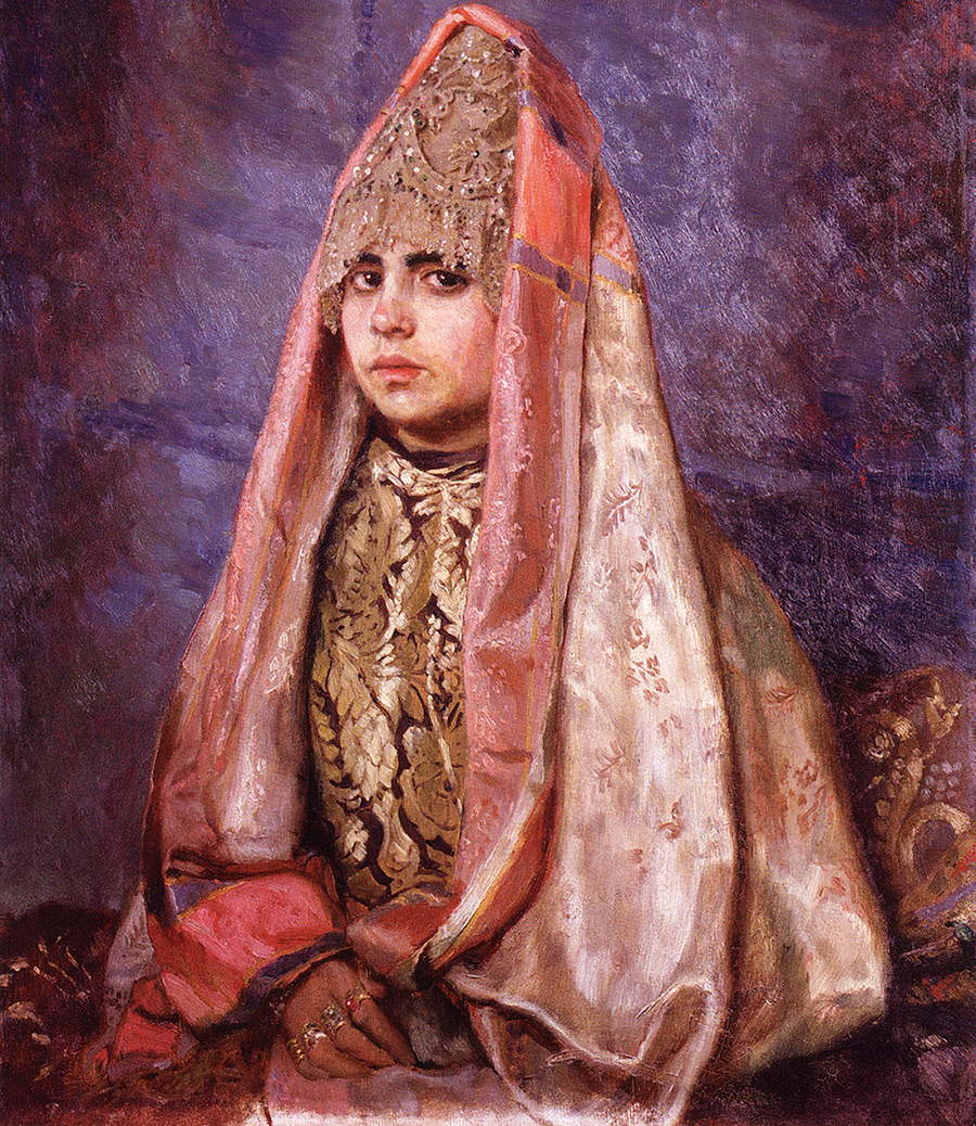 Un kokoshnik est une coiffe avec une partie frontale haute. Une couverture en tissu coûteux pouvait être attachée à l'arrière du kokochnik, et à l'avant, elle était abondamment décorée de perles.