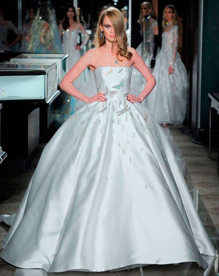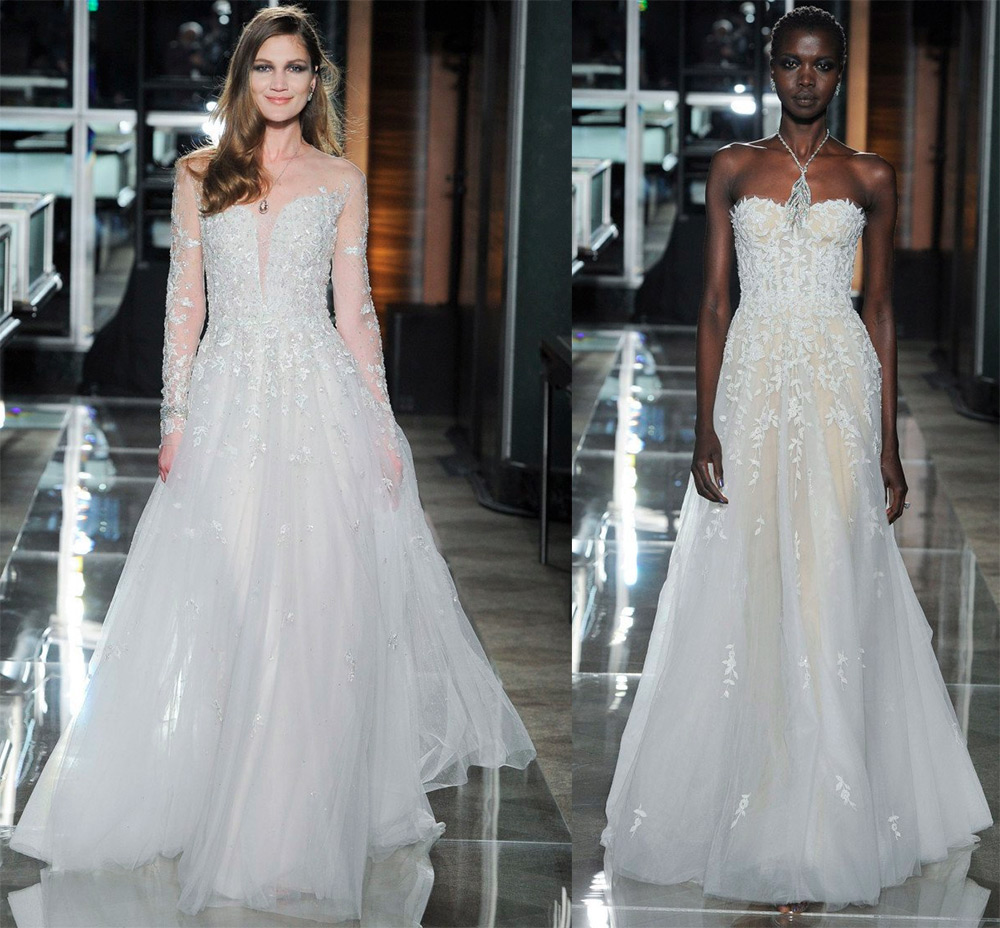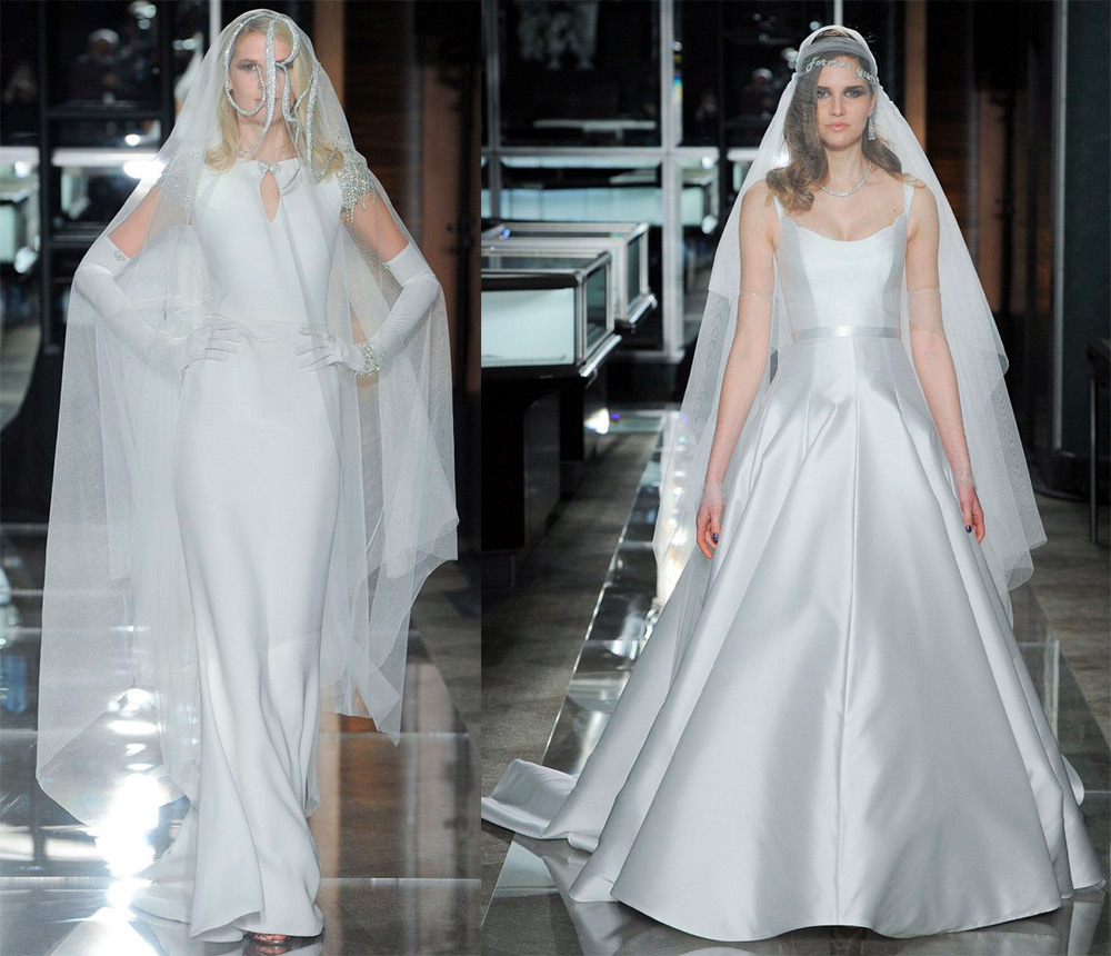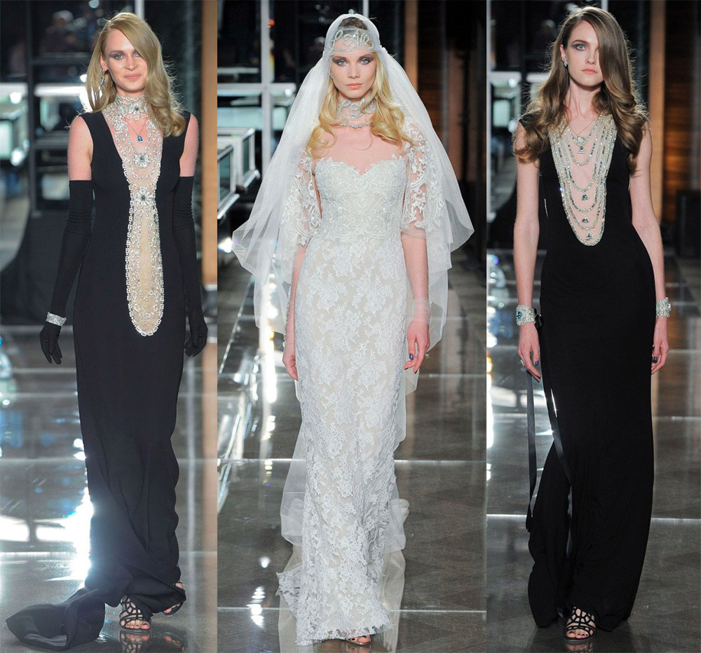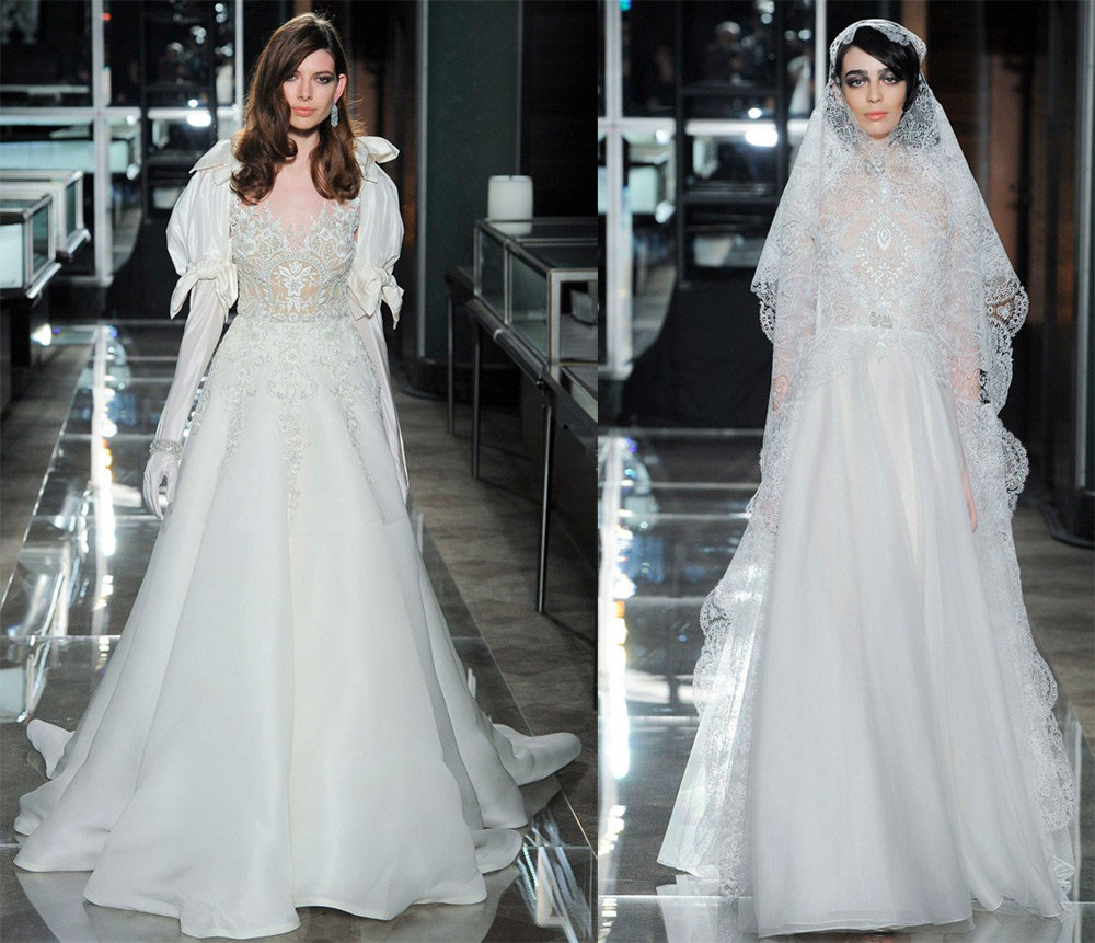 Les robes sont décorées de nœuds noirs, de cristaux étincelants et sont complétées par de longs gants. Les robes blanches sont traditionnellement décorées de dentelle. La collection Reem Acra s'inspire du glamour d'une femme de Tiffany. Par conséquent, les nouveaux looks de mariage de Reem Acra plairont à de nombreuses mariées.