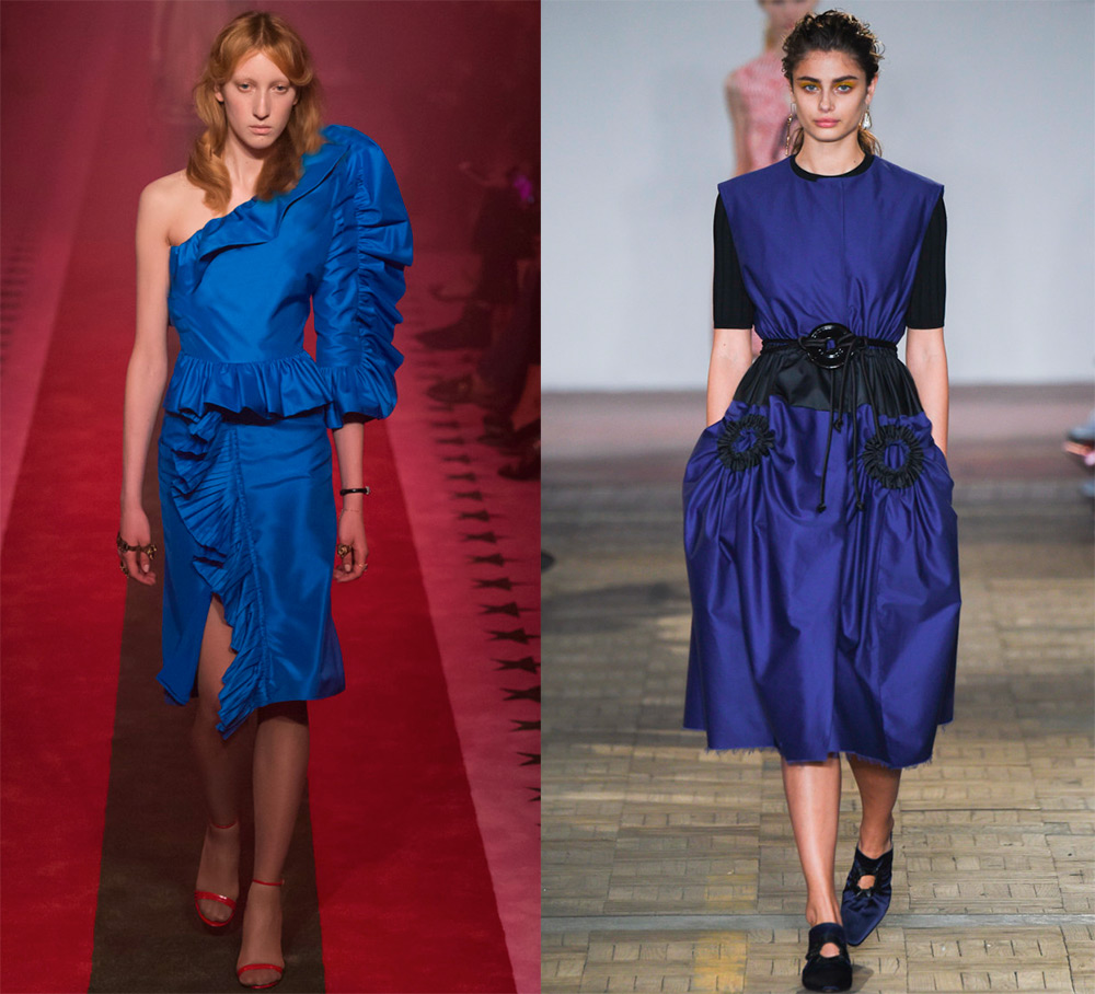 Gucci, SportmaxIl y a toujours de la place pour le bleu dans les collections Giorgio Armani. Dans ses modèles pour le défilé printemps-été, presque toutes les nuances de bleu sont parfaitement combinées dans les tissus. Les robes bleues de la collection Agnona sont également lumineuses et élégantes, et le designer Jason Wu en bleu noble de différentes nuances a créé plus d'un modèle de robes et de costumes.