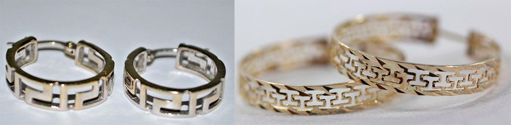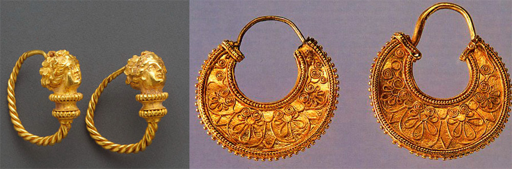 Les boucles d'oreilles grecques ressemblaient parfois à des images de dieux ou représentaient un disque avec de petits motifs et incrustés, d'où pendaient de minces pendentifs. Lors du déplacement, ces boucles d'oreilles sonnaient magnifiquement. Le disque était gracieusement gravé d'images de divers objets ; les pendentifs reprenaient la forme d'amphores ou d'animaux.