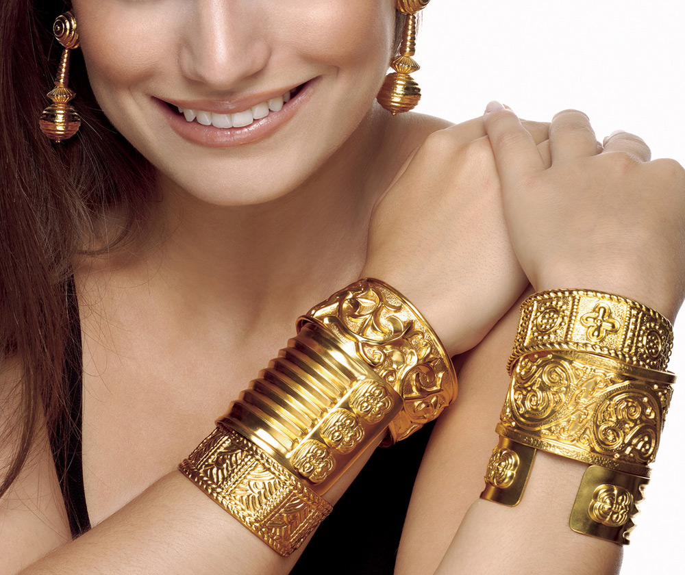 Les femmes grecques étaient très friandes de bracelets; elles essayaient de souligner la grâce de leurs mains avec eux, les mettant non seulement sur le poignet, mais aussi sur l'avant-bras. Les bracelets étaient fabriqués sous la forme d'un seul large cerceau en métal précieux ou de plusieurs anneaux minces, qui étaient portés en grand nombre. Les bracelets larges peuvent être décorés de motifs ornementaux, tels qu'un méandre ou des lignes torsadées d'un caractère végétal.