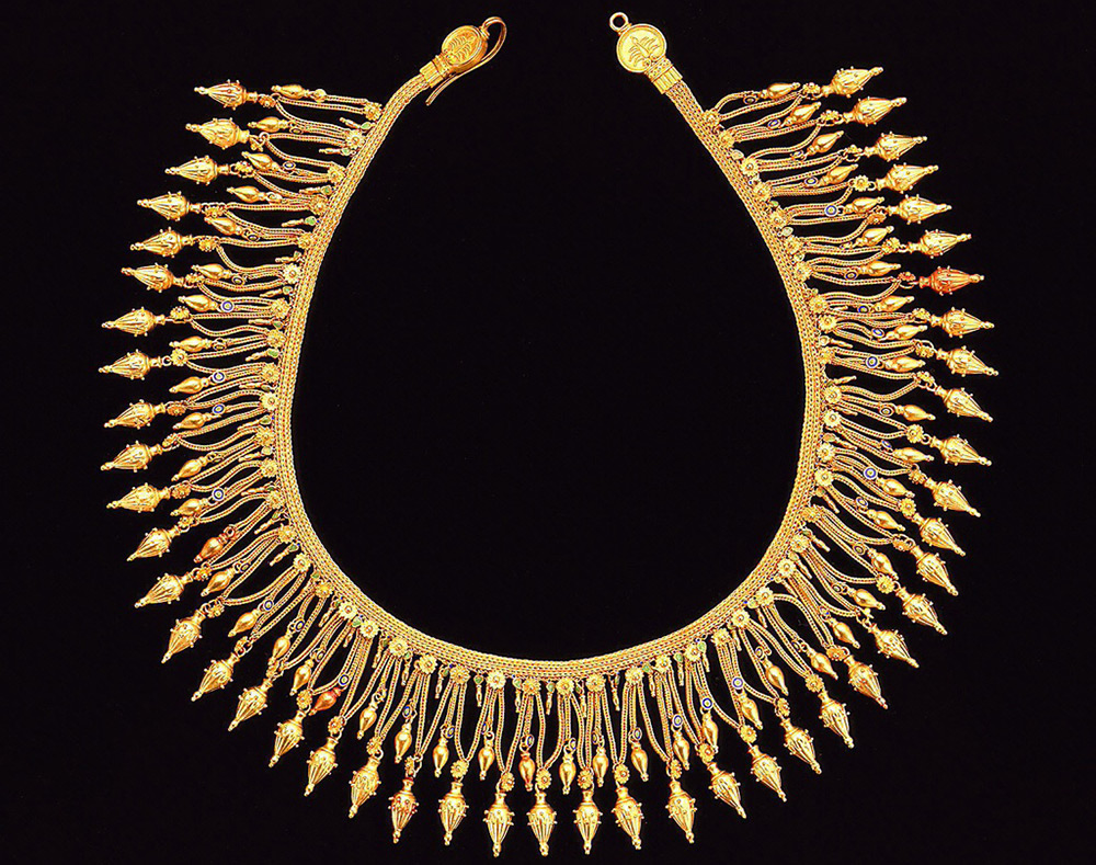 Les bijoux de cou étaient parfois assemblés à partir d'éléments séparés, soudés les uns aux autres ou reliés mécaniquement. Dans la technique de la joaillerie, la méthode de soudure diffuse était très courante, à l'aide de laquelle un grain ponctuel était obtenu. Les colliers et les couronnes avaient une variété de pendentifs sous la forme de fruits, de fleurs, de dauphins et d'autres animaux.
