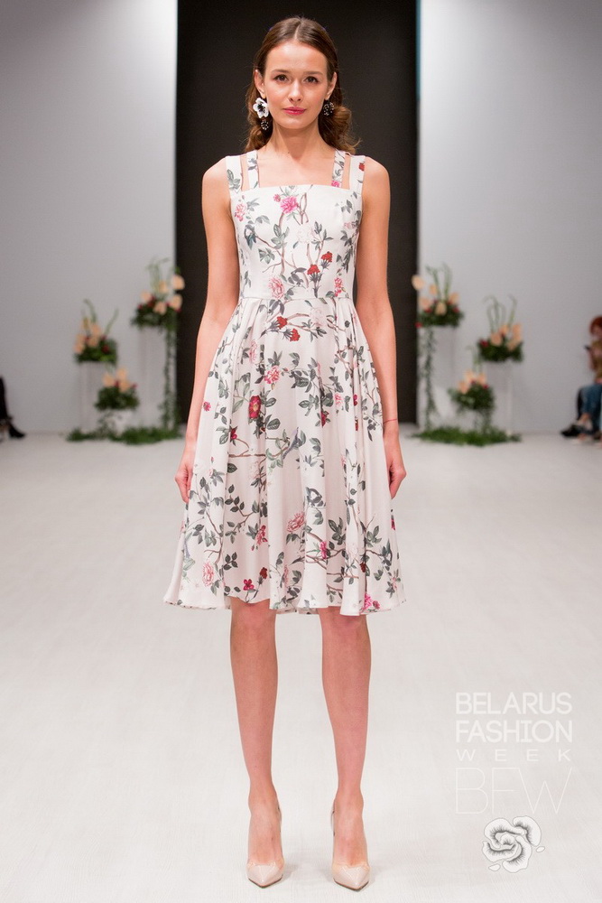 Un grand nombre de robes sont décorées avec une grande variété de fleurs et de motifs floraux. Toute la collection est divisée en blocs de tissus et de couleurs, qui comprennent des robes de soirée longues et des robes de cocktail.