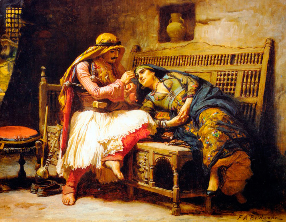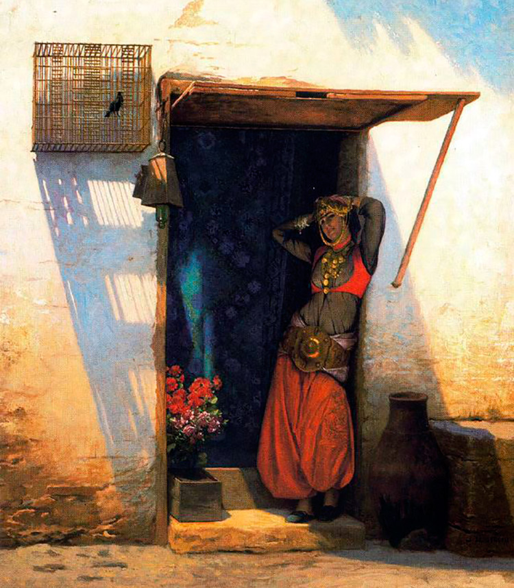 Frédéric Arthur Bridgeman (1847-1928)Dans le même temps, dans différentes parties de l'ancien califat arabe, le voile féminin finira par acquérir des caractéristiques locales et des noms différents. Ainsi, dans les pays du Moyen-Orient, le voile commencera à s'appeler la burqa, très probablement du mot persan ferenje, qui signifie "trou", "feuille de fenêtre". Un tel voile couvrait complètement la silhouette et ne laissait que pour le visage une sorte de "fenêtre" - une fenêtre sous la forme d'un tissu à mailles épaisses.