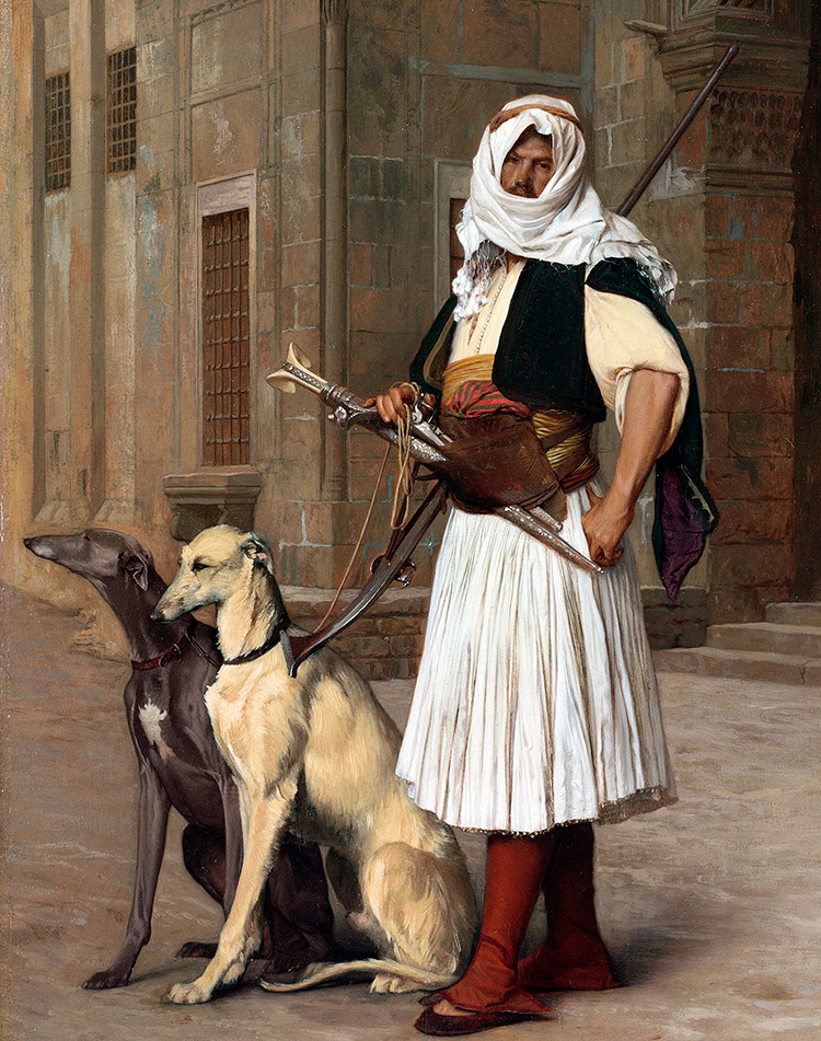 Arabe avec deux chiensUne telle chemise se composait de deux panneaux cousus et était nécessairement ceint d'une ceinture. Au-dessus de la chemise, une cape d'abbas était portée - une cape en laine de mouton ou de chameau. Le couvre-lit était fait d'un morceau de tissu quadrangulaire et était attaché à la tête avec une tresse.