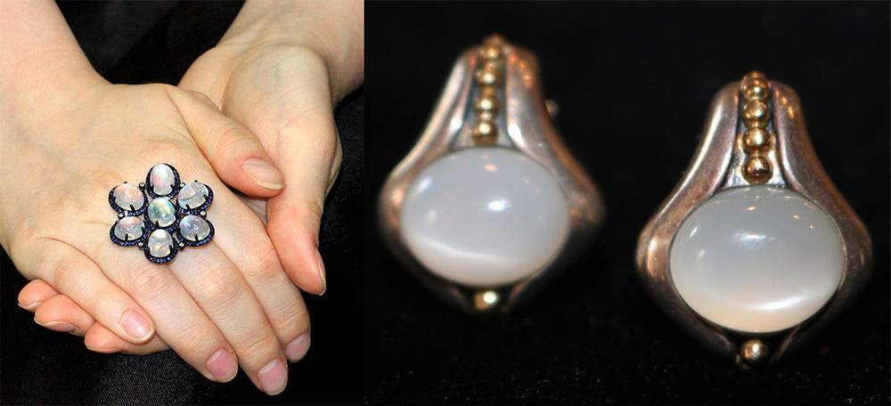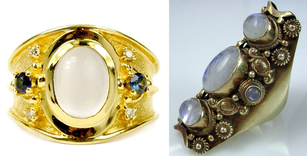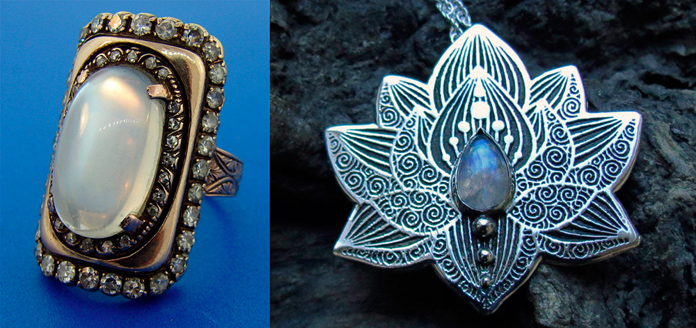 Comme déjà mentionné, la plupart des pierres de lune sont taillées en forme de cabochon. René Lalique l'a souvent utilisé dans ses produits, car il se marie bien avec les éléments en cristal et l'argent. C'est adularia avec ses nuances de couleurs, si proches du clair de lune, qui est d'une beauté époustouflante en argent. Et la pierre de lune, dans laquelle il y a une teinte bleu verdâtre, a l'air luxueuse en or.