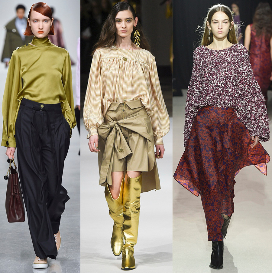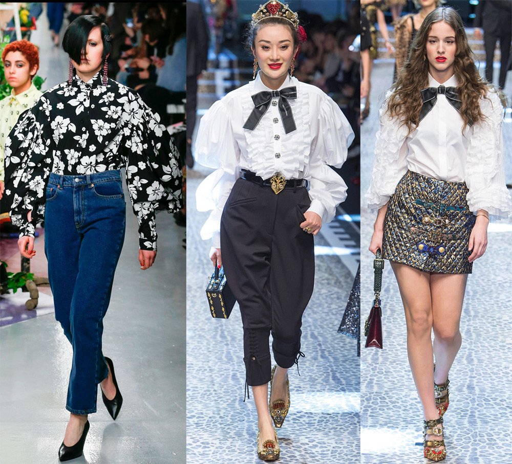 Les plus populaires sur le podium étaient les chemisiers blancs, les chemisiers-chemises, les chemisiers légers transparents. Tout comme dans les robes, l'accent est mis sur la ligne des épaules et les manches volumineuses. Avec seulement quelques éléments qui ornent le chemisier, de nombreux styles créent une ambiance romantique. Ces éléments peuvent être des nœuds et des nœuds, des volants et des volants, des volants et des plis ... L'asymétrie et la négligence continuent de triompher dans la mode.