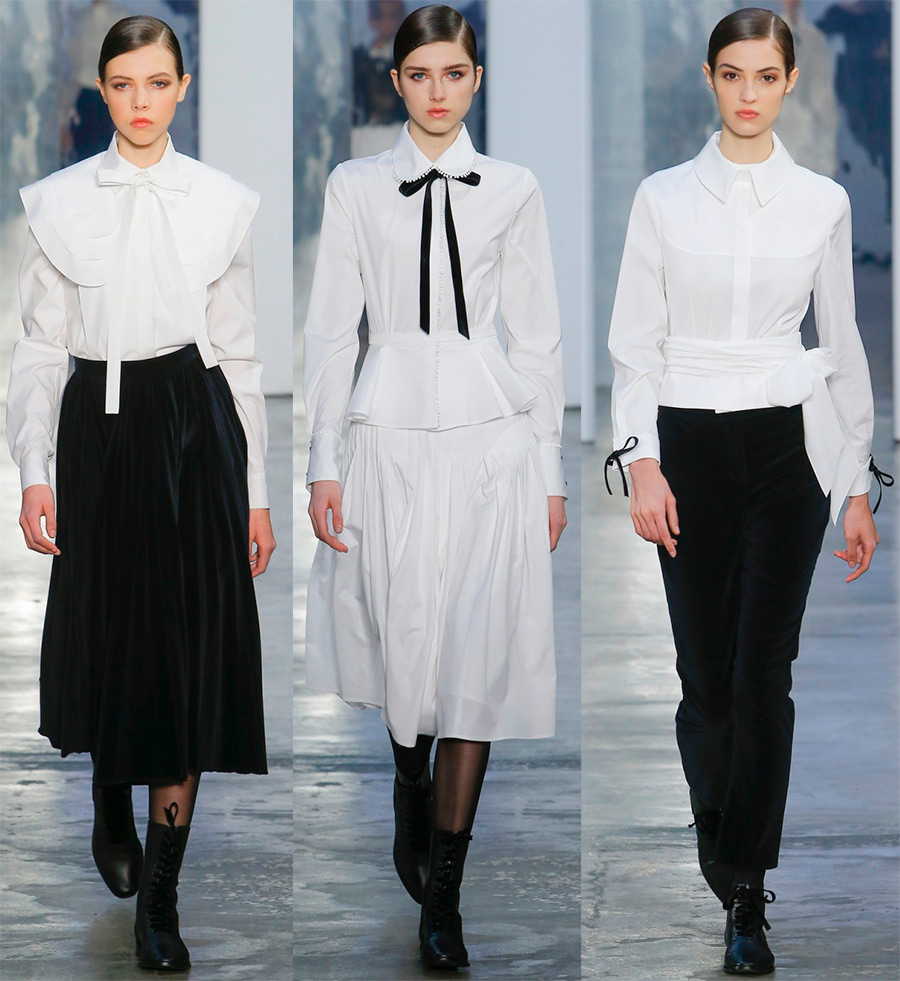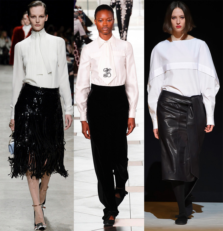 Isa Arfen, Jacquemus, Johanna OrtizLa décoration des blouses blanches conserve sa couleur blanche inchangée, car les volants, les volants, les nœuds et les nœuds, ainsi que les cravates, restent le plus souvent blancs, bien qu'un nœud noir ou une cravate noire intervienne parfois.