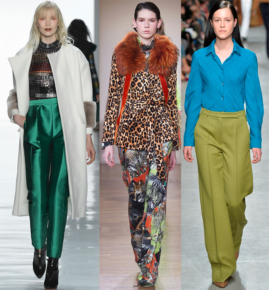 Escada, Lanvin, Max MaraLes créateurs choisissent des matières pour les pantalons, à la fois denses et légères. Parmi eux se trouvent la laine, la maille, le tweed, le cachemire, le satin, la soie, le velours, le cuir.