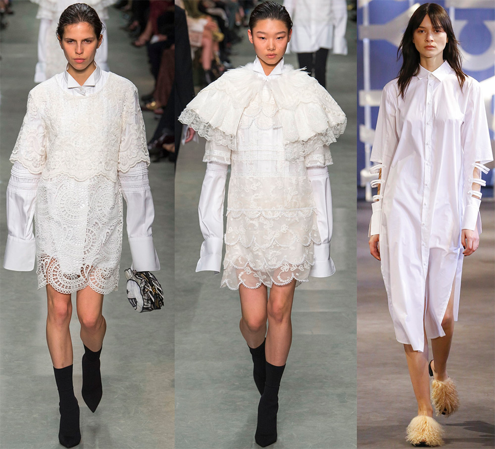 robes blanches à la mode automne-hiver 2025-2026, variété. Il peut s'agir de tricots chauds et confortables, de laine, de satin, de mousseline, de taffetas, de guipure, de dentelle et autres..