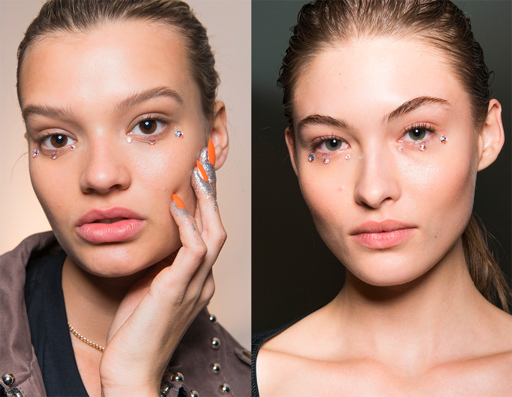 La tendance de l'appliqué en différentes versions s'est enracinée sur les podiums. Pour refaire, par exemple, le maquillage de Jeremy Scott, pas besoin d'avoir les compétences d'un pro : du minimalisme et quelques strass sous les yeux, c'est fini. Mais avec l'image de Laurence & Chico ce sera plus difficile, mais d'autant plus intéressant : il s'agit à la fois d'applications et de maquillage des lèvres non anodin.