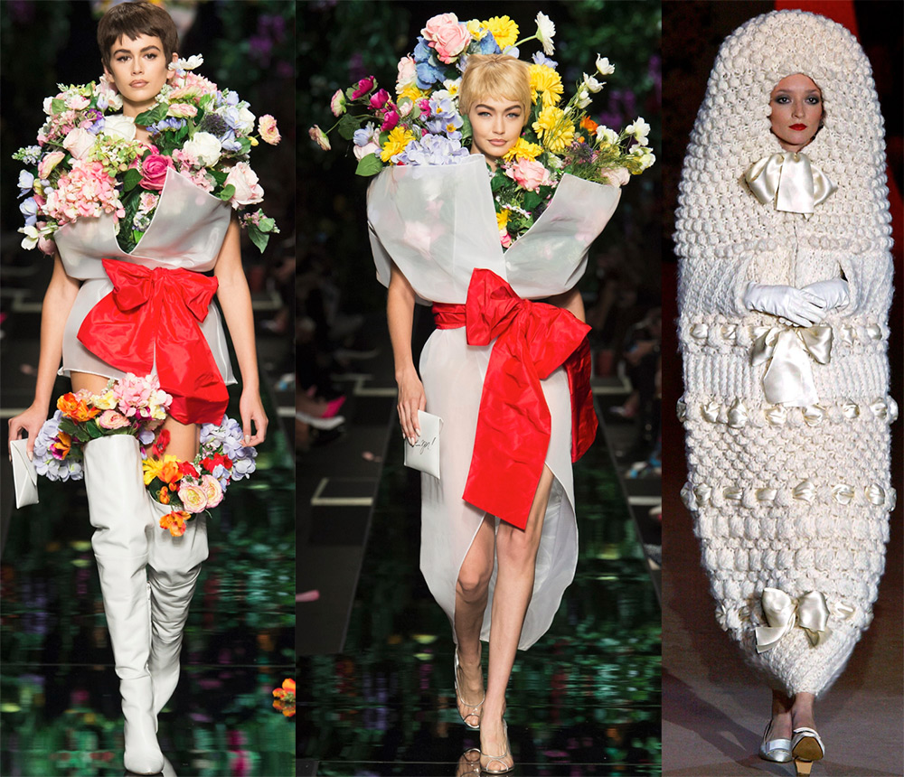 Certaines marques dans littéralement toutes les collections présentent des vêtements et des accessoires qui se moquent de la mode moderne et des fashionistas, d'autres sont simplement ironiques à propos de la mode. La marque italienne Moschino est très douée pour ce genre de choses, elle propose des robes et des accessoires insolites avec un design amusant.