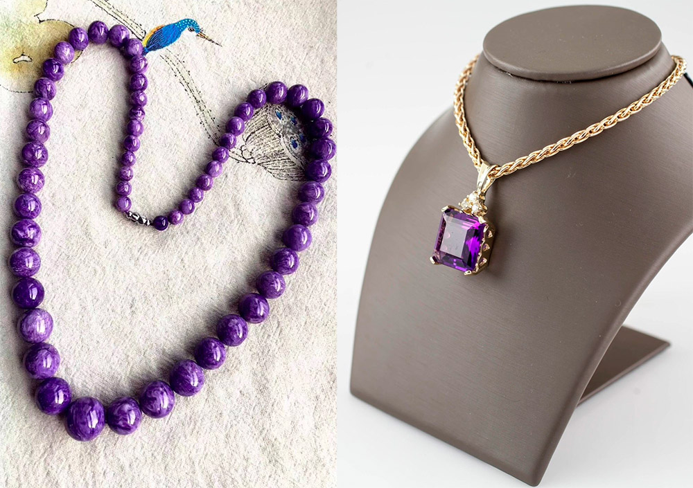 4. Charoïte. L'améthyste est une pierre assez courante, tout le monde la connaît, et cela efface l'aura de mystère des bijoux. La Charoïte c'est autre chose, peu de gens le savent. De plus, la charoite est une véritable rareté pour peu d'argent. Il n'y a qu'un seul gisement de pierre charoïte dans le monde, il est situé