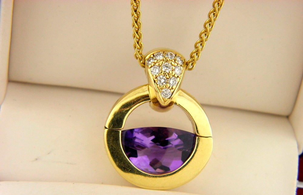 2. Or, argent et d'autres métaux avec des émaux. La technologie d'application des émaux s'améliore et se simplifie en même temps. Il n'est pas facile de trouver des bijoux avec des émaux violets, malgré le fait que cette couleur, avec l'or, est vraiment luxueuse.