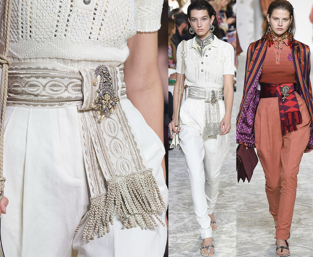 Ceinture avec broderie et franges. Ces accessoires sont entrés dans la mode moderne à partir de divers costumes nationaux. Larges et douces, ces ceintures s'enroulent plusieurs fois autour de la taille. Ils peuvent être de largeur uniforme et se rétrécir vers les extrémités. Dans la collection Etro, il y a des écharpes avec un décor riche - broderies et franges ; il y a aussi des écharpes faites de textiles qui diffèrent par la couleur, l'imprimé et la texture. Il existe des accessoires avec des motifs rappelant les ceintures d'amulettes.