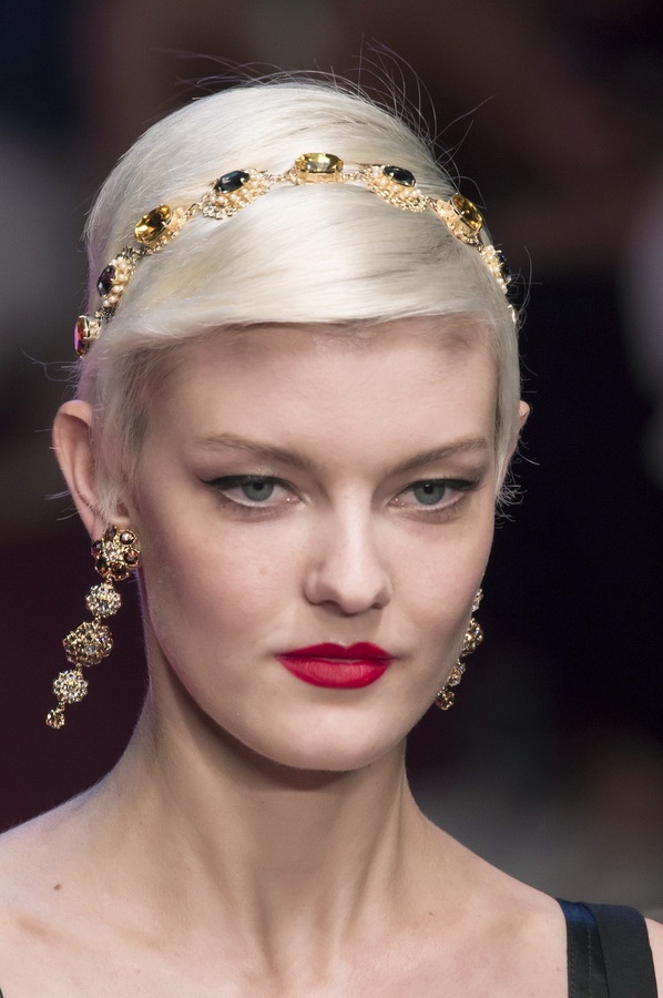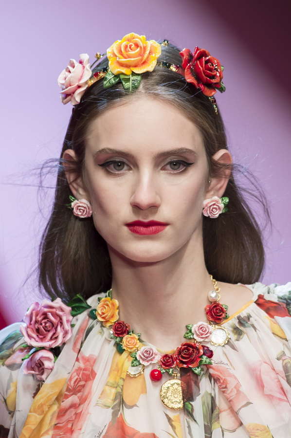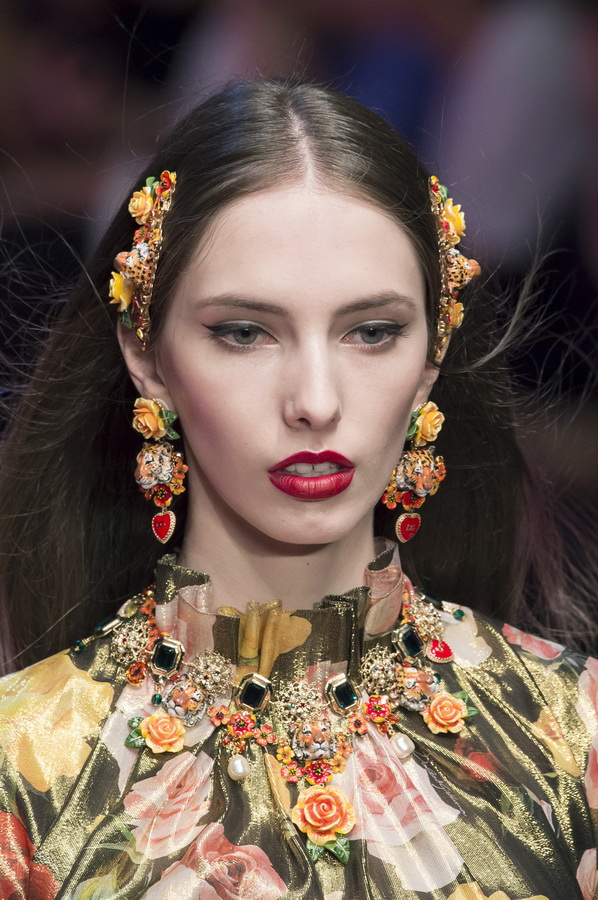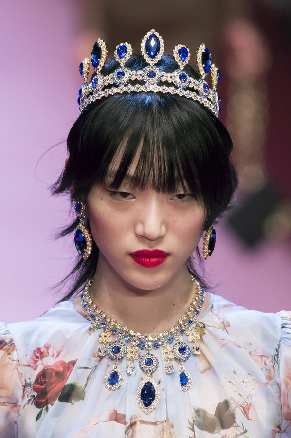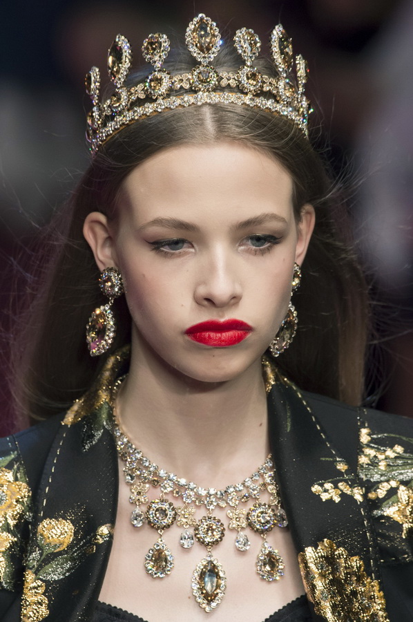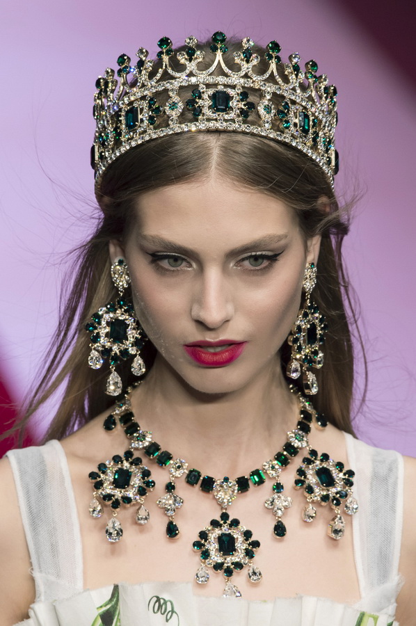 Dolce & Gabbana propose toujours des bijoux de luxe - colliers, colliers, boucles d'oreilles, bandeaux et diadèmes qui répondent aux normes de beauté traditionnelles et sont compris de tous. L'essentiel est de choisir des bijoux qui correspondent à la robe, ou vice versa.
