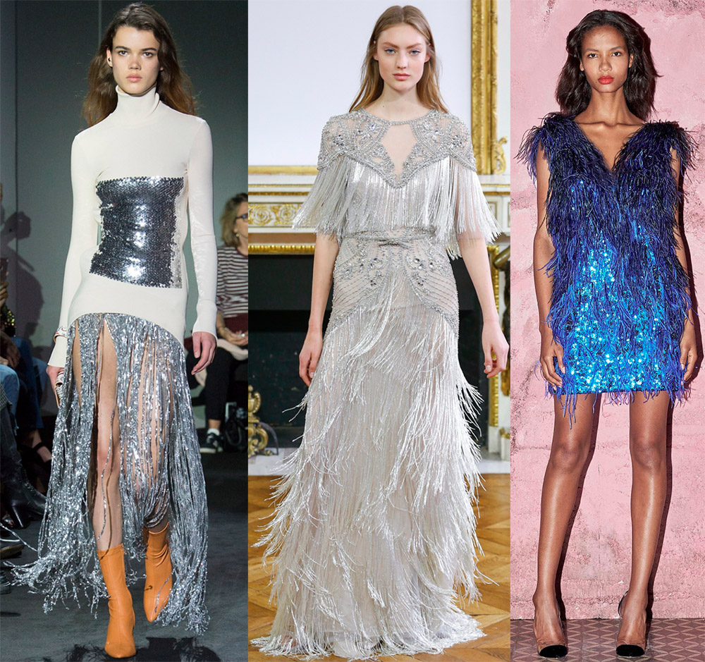 Les créateurs offrent une autre option - combiner des franges avec des paillettes et des strass.Et cela semble déjà exceptionnellement magnifique. Et où porter, décidez vous-même.