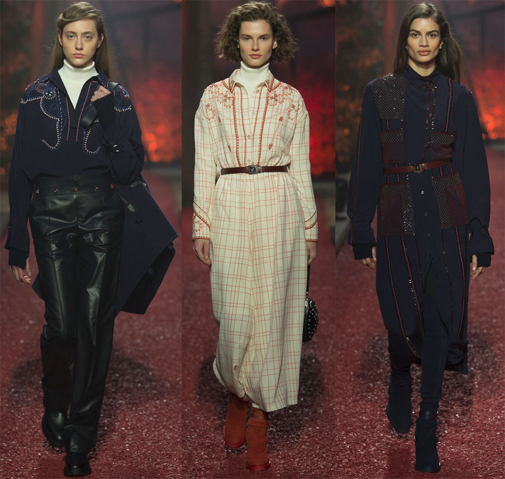 Nadezh Vane - Cybulski, restant fidèle aux traditions de la maison Hermès - minimalisme et coupe laconique, a choisi des robes midi strictes, des chemisiers bien fermés, des pulls à col montant, des jupes crayon et des manteaux en cuir aux tons neutres comme éléments clés. Le designer a utilisé des chaussures comme accents lumineux. Presque chaque look était complété par un accent brillant - des bottes hautes en daim olive, rouge, gris et rouge foncé.