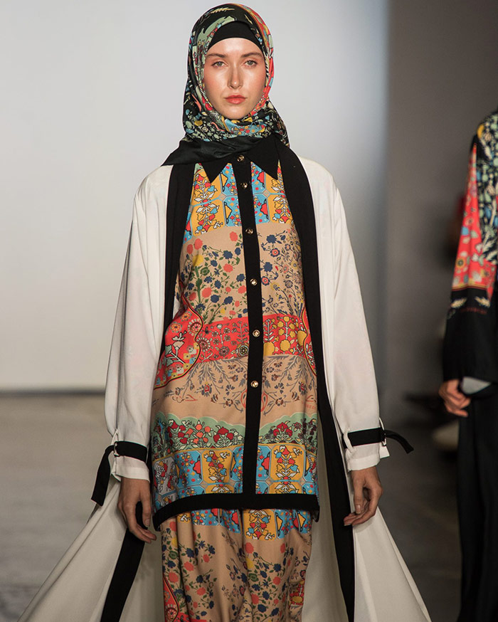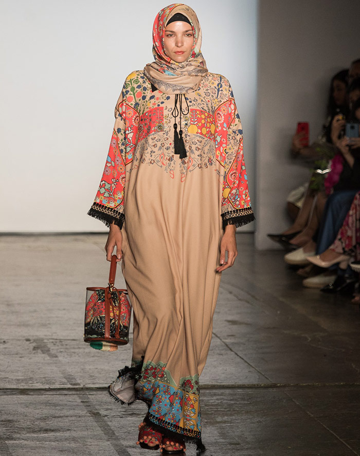à New York... La créatrice privilégie les robes de type abaya. Les looks de Vivi Zubedi sont toujours intelligents et riches. Certaines robes et foulards de la marque sont ornés d'un monogramme qui ressemble beaucoup au monogramme d'une marque célèbre.