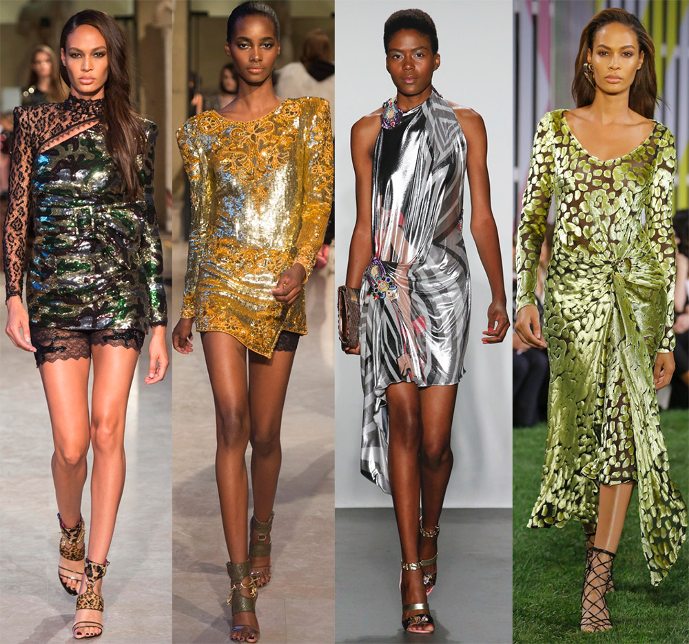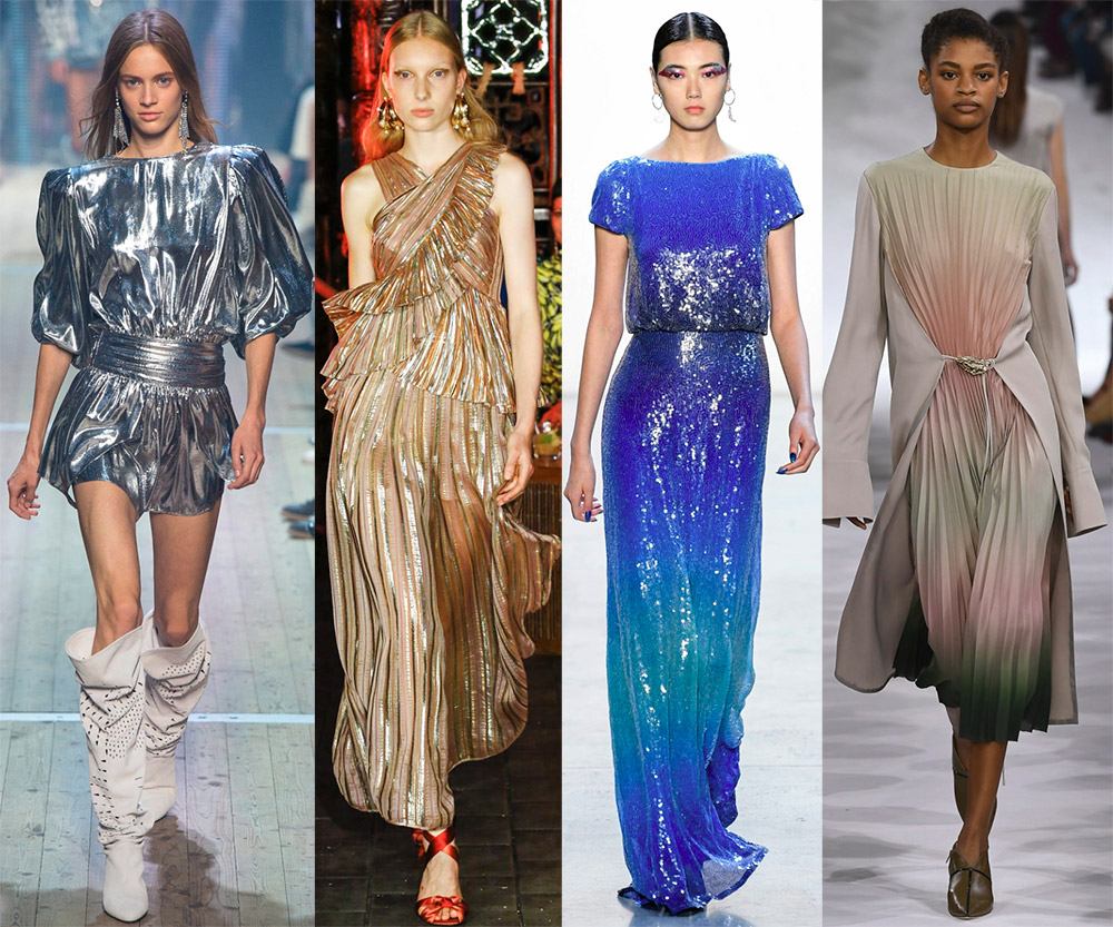 Il existe de nombreuses façons de faire briller, scintiller ou faire briller un tissu. Les collections comprennent également du lin dur avec de la méthanite pour l'or ou l'argent, du brocart coloré, du plastique, du polissage et des effets de métal en fusion. Parmi eux se trouvent des tissus épais et grossiers avec une dorure et une soie exquise, chatoyante de reflets lumineux, du satin à la douceur de la porcelaine.