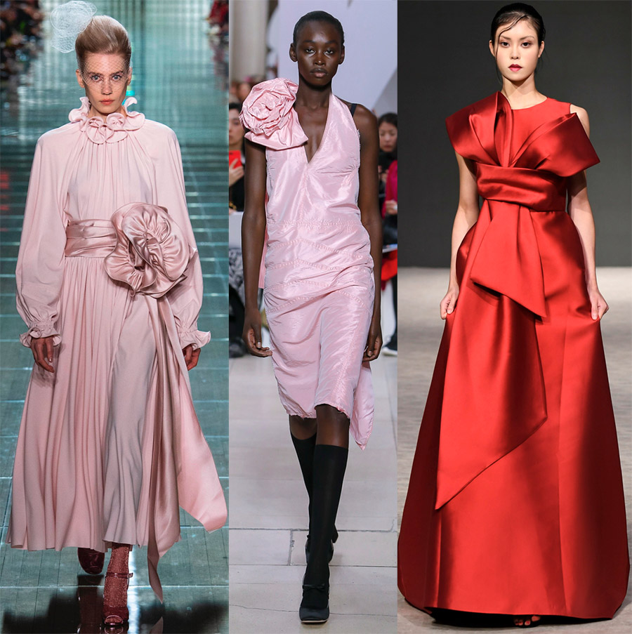 Les silhouettes amples continuent d'être dans les collections. Des tissus de différentes textures permettent d'interpréter le thème du volume. Certains d'entre eux ont une silhouette en A longue au sol, luxuriante avec une abondance de volants et de volants, d'autres ressemblent à la maîtresse Dymkovo (jouets Viatka) dans une tenue colorée et lumineuse.