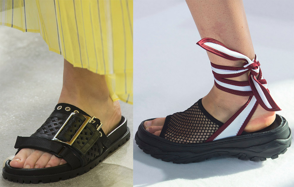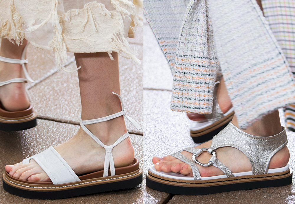 Les chaudes journées d'été sont propices aux longues promenades. Par conséquent, le choix des chaussures doit certainement être en faveur des sandales et des tongs, qui abondent dans les collections. Mais cette fois sur le podium, il y a des sandales avec une semelle plus épaisse et même sur une plateforme. Pour plus d'agressivité, elles sont agrémentées de boucles et de larges bretelles.Ces chaussures sont parfaites pour un style décontracté.
