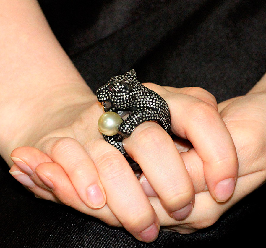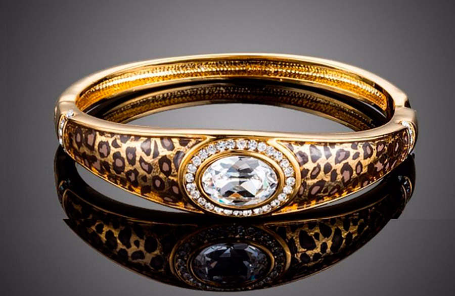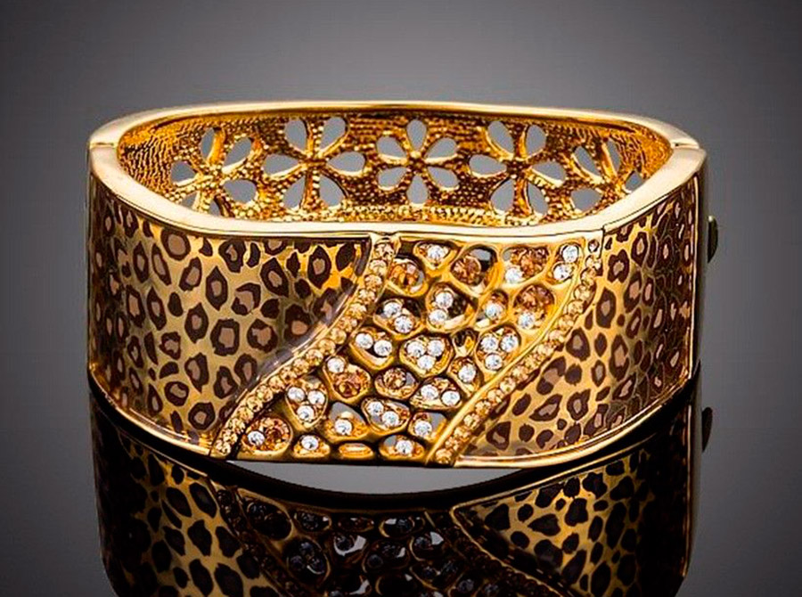 Bien sûr, l'or jaune est le meilleur pour créer des motifs de léopard. Les joailliers proposent des léopards chics en or 585 et 750, parfois ornés de pierres précieuses. En plus de l'or jaune, il existe des options en métal blanc. La mode permet une grande variété de couleurs de léopard, même psychédéliques. Bien que l'or blanc avec des diamants ressemble plus à un léopard des neiges. De tels bijoux sont chers et inaccessibles à la plupart des filles. Mais les bijoux ouvrent de nombreuses opportunités pour créer des images.