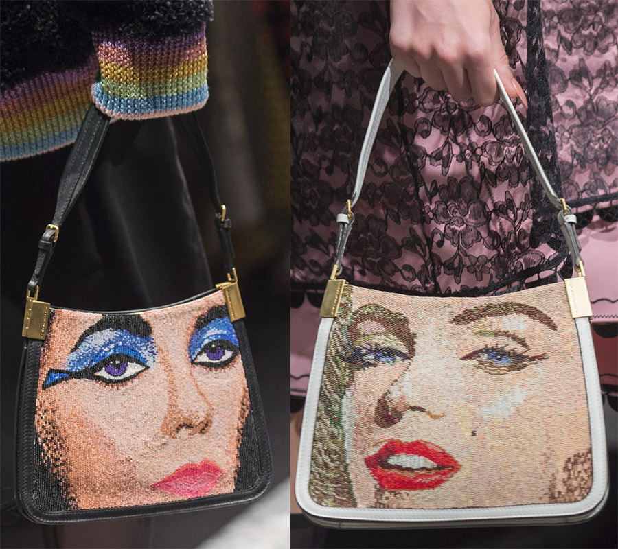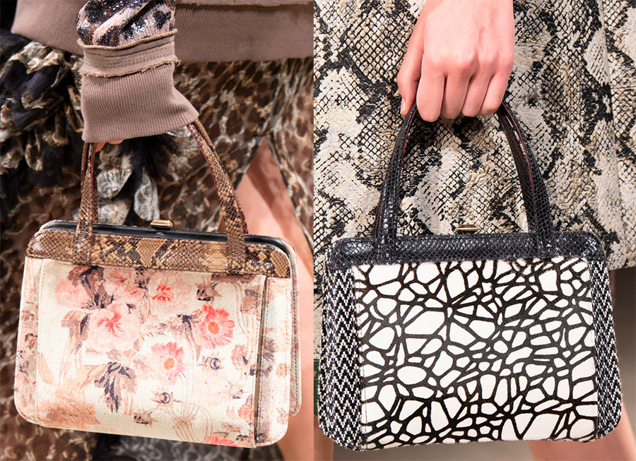 Matériau du sac peut être très différent, les technologies modernes vous permettent d'appliquer des impressions sur n'importe quelle surface. Les options les plus courantes sont les sacs à main en cuir avec des imprimés, puis les textiles, une combinaison de différentes textures. Il existe des modèles en plastique à la mode, parfois le motif est appliqué sur le filet, et Simonetta Ravizza propose des sacs en fourrure avec des images et des inscriptions.