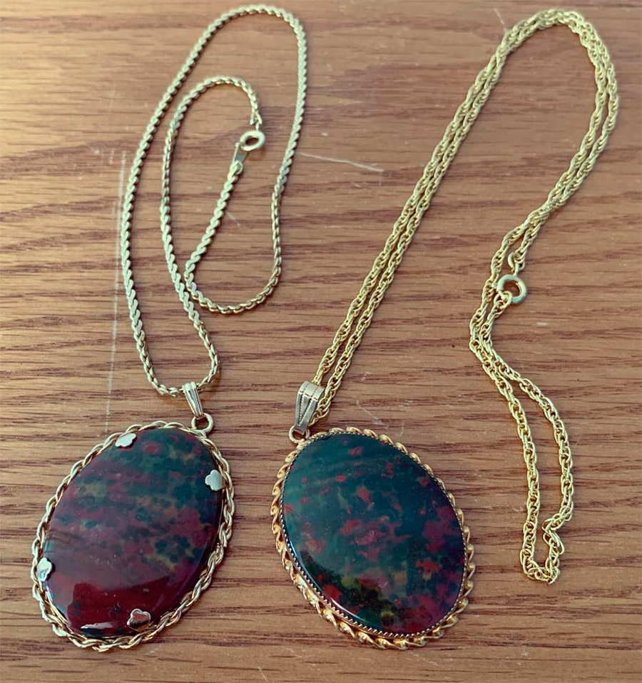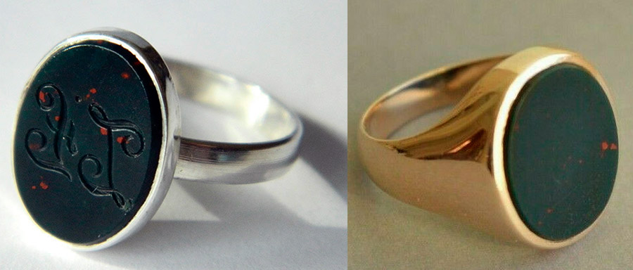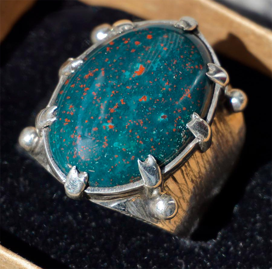 bijoux pour femmes et hommes... Les sceaux et bracelets pour hommes sont très beaux. Les perles, broches et pendentifs avec héliotrope sont magnifiques. La pierre est magnifique en or et en argent, mais, comme le recommandent les connaisseurs des propriétés magiques de l'héliotrope, les meilleurs réglages pour elle sont le fer, l'acier et le laiton. L'héliotrope est une pierre peu coûteuse, les contrefaçons sont donc rares. Habituellement, ils peuvent être des imitations de plastique ou de verre.