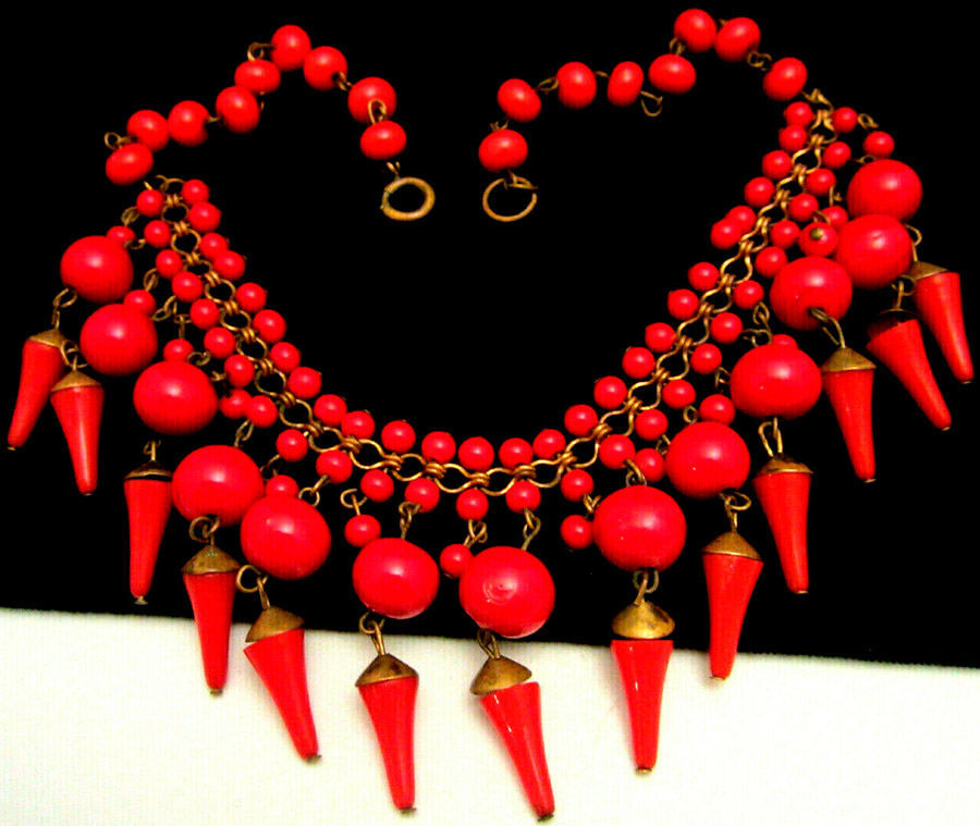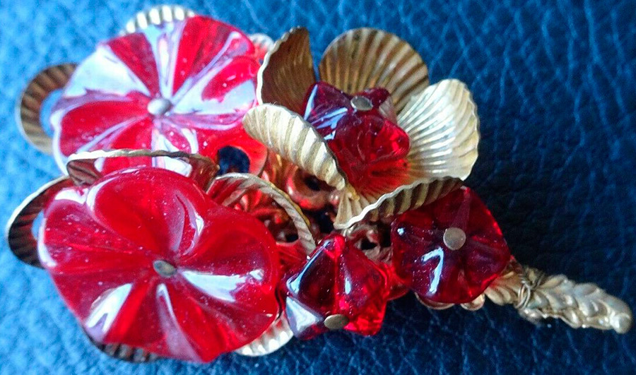 verre de Murano, perles tchèques, émail, produits dorés, et pendant la Seconde Guerre mondiale - plastique et bois. Bracelets, colliers et boucles d'oreilles étaient parfois réalisés dans un style héraldique, on pouvait même y lire des phrases latines.
