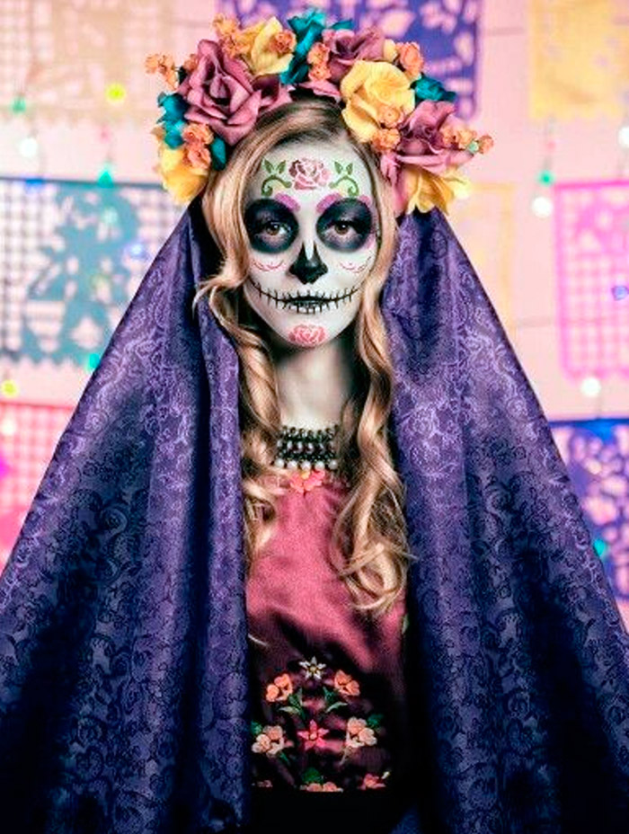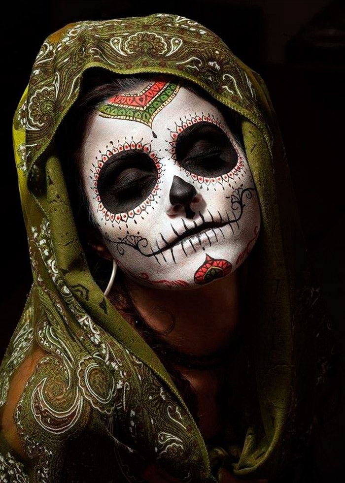 Le maquillage du masque mortuaire de Calavera n'a pas besoin d'être exceptionnellement sombre et sinistre. L'idée principale des vacances est d'apprendre à percevoir la vie et la mort avec un grain d'humour et de pouvoir profiter de chaque instant, même en se rappelant que nous mourrons tous un jour. Si vous faites d'une telle philosophie le principe principal de la vie, il n'y aura pas de peur de la maladie et de la mort, car pourquoi avoir peur de quelque chose que personne ne peut éviter. De plus, la mort n'est qu'une porte vers un autre monde.