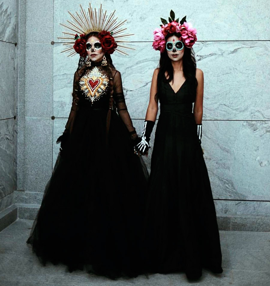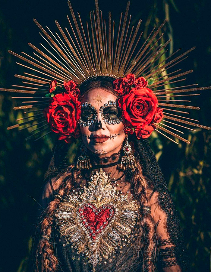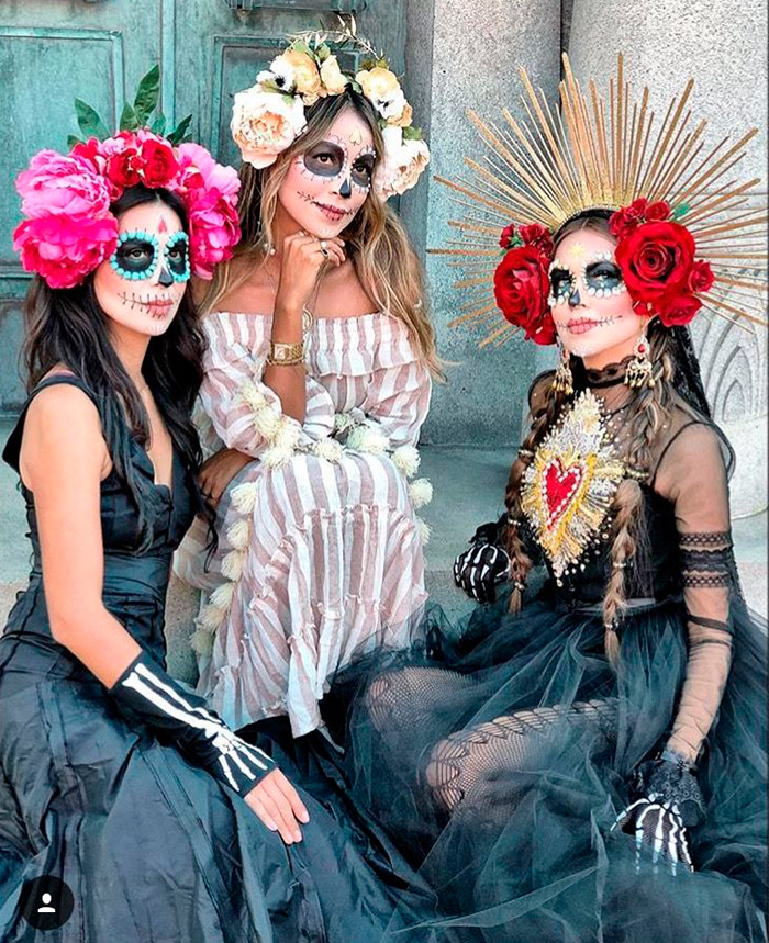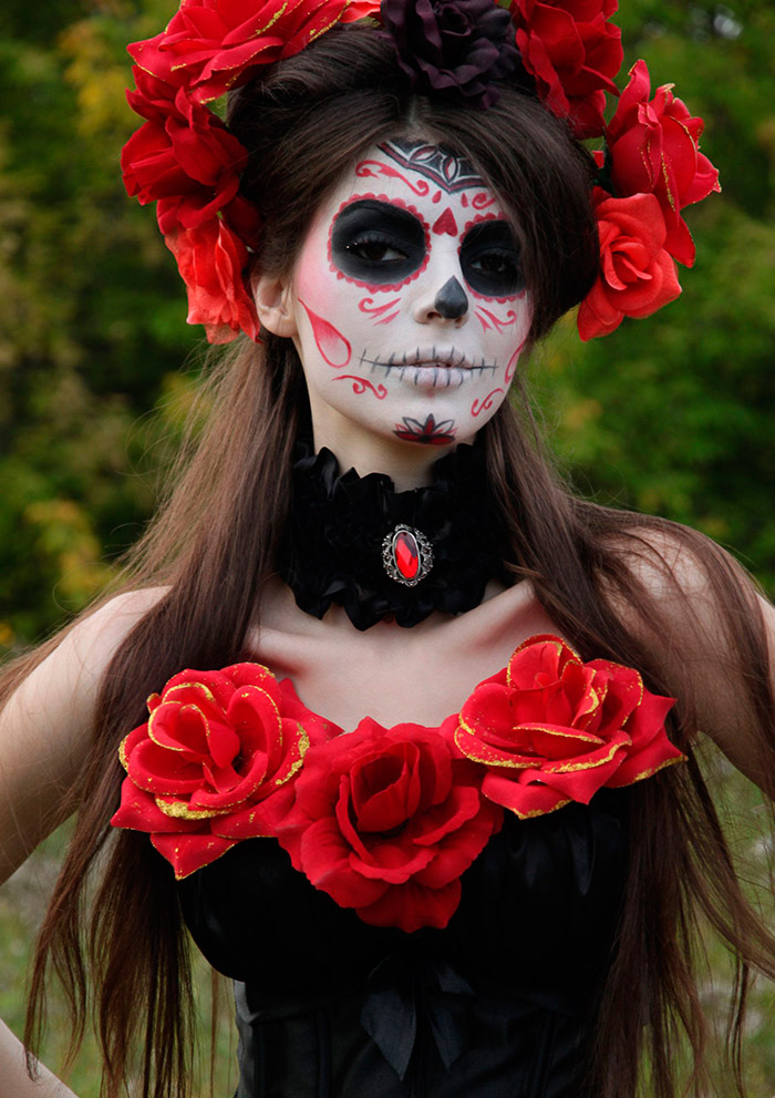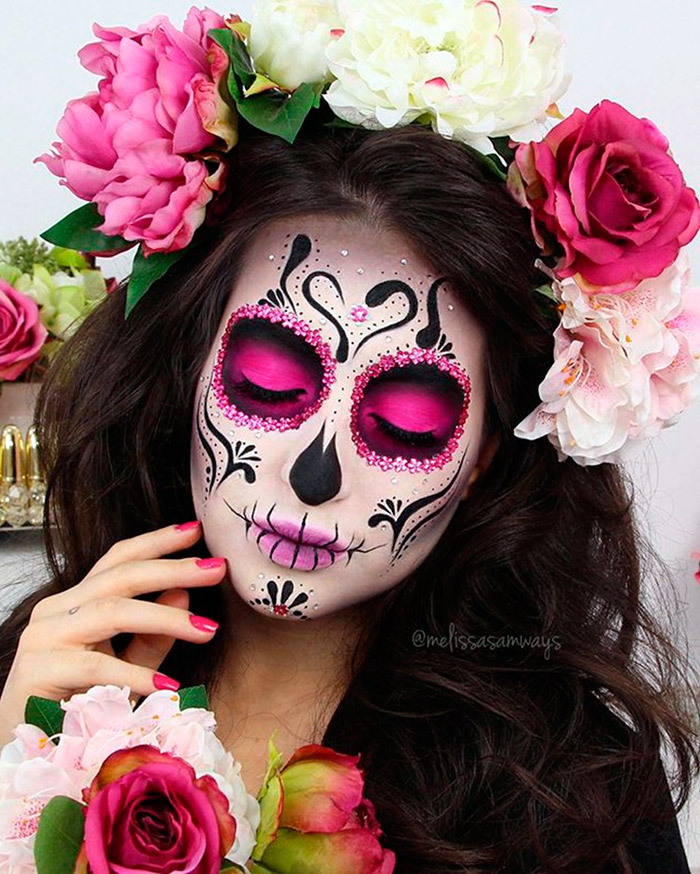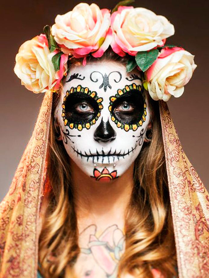 Idéalement, faites d'abord une base blanche, puis utilisez des traits noirs et toutes les couleurs disponibles dans la trousse de maquillage. Les couleurs rouge, verte, bleue et rose ajouteront des vacances à l'image et les ornements floraux rendront le masque Calavera plus mignon et délicat. Vous pouvez compléter le look avec des roses vivantes en décorant un serre-tête ou un diadème avec des fleurs.