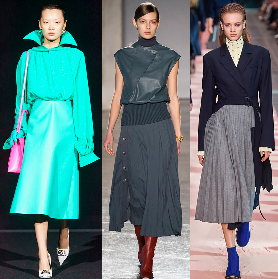 Les créateurs proposent des jupes plissées à porter avec des vestes, y compris volumineuses, des pulls, des sweats, des chemises et des chemisiers... Par exemple, dans la collection