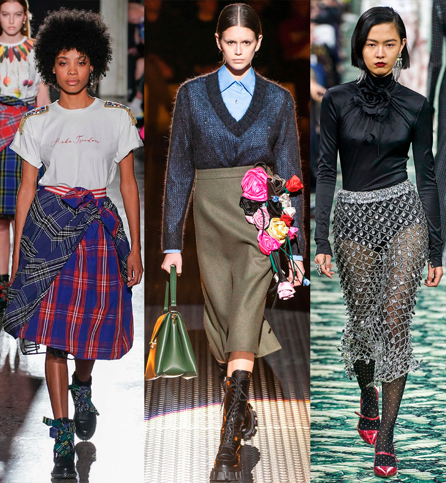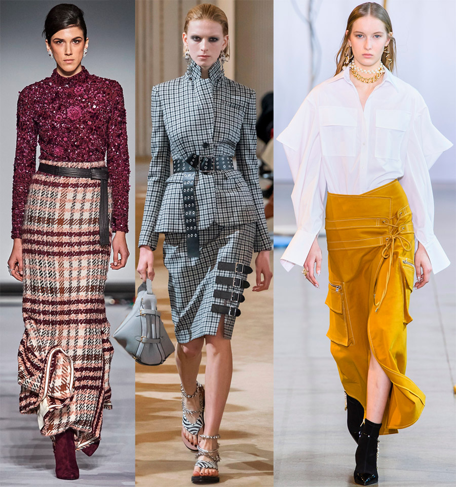 Paco Rabanne, Burberry, Derek LamTout modèle commence par le choix d'un style, ainsi une jupe peut devenir un vêtement unique. Il existe de nombreux styles qui se distinguent par une coupe complexe et une abondance de décor. Les jupes fendues sont courantes.