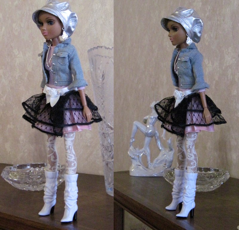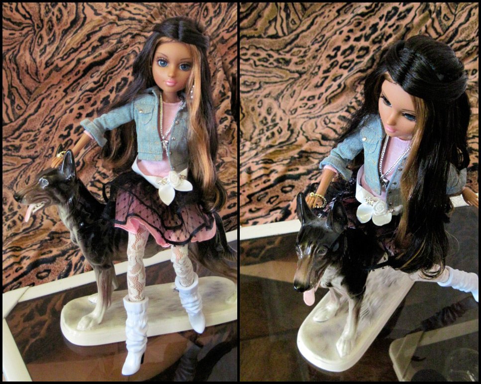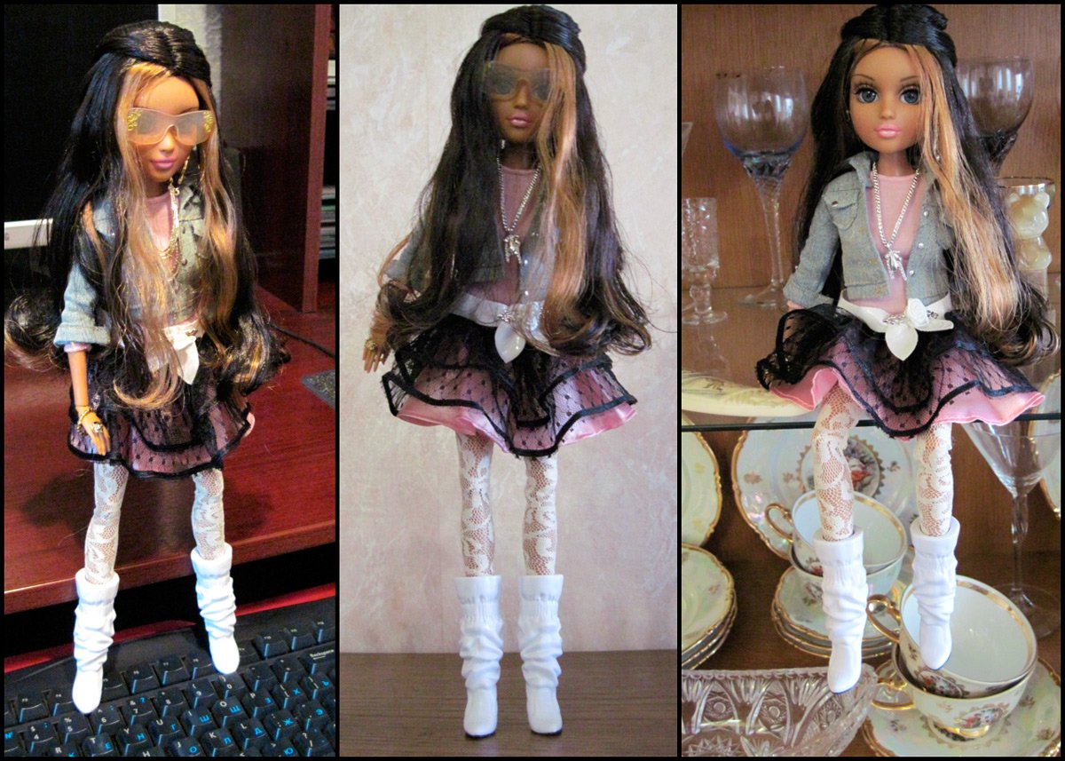 Il n'y a pas non plus de problème pour habiller notre beauté, les vêtements s'habillent facilement et épousent la silhouette. Le seul inconvénient au niveau des vêtements est qu'il y a peu d'ensembles en vente. En plus du petit choix de vêtements, il y a un autre inconvénient - les perruques ne tiennent pas très fermement et, si la poupée est transplantée, réarrangée, elles peuvent s'affaisser. Mais à mon avis, ce sont des bagatelles, et toute artisane trouvera plusieurs solutions à ce problème. Il existe des solutions toutes faites sur les forums de poupées, ou vous pouvez trouver la vôtre. Je réfléchis encore, mais dans un avenir proche, nous trouverons un moyen de sécuriser au mieux les perruques. Perruque de remplacement quand même, bien mieux Cheveu cousu à la tête de la poupée. Il y a beaucoup plus d'opportunités pour changer l'image, et changer de vêtements est beaucoup plus facile. Et si vous avez le temps et l'envie, vous pouvez créer votre propre perruque, modeler des coiffures, décorer Moxie de fleurs et tisser des rubans dorés.