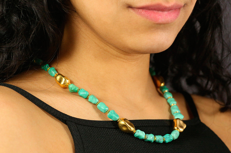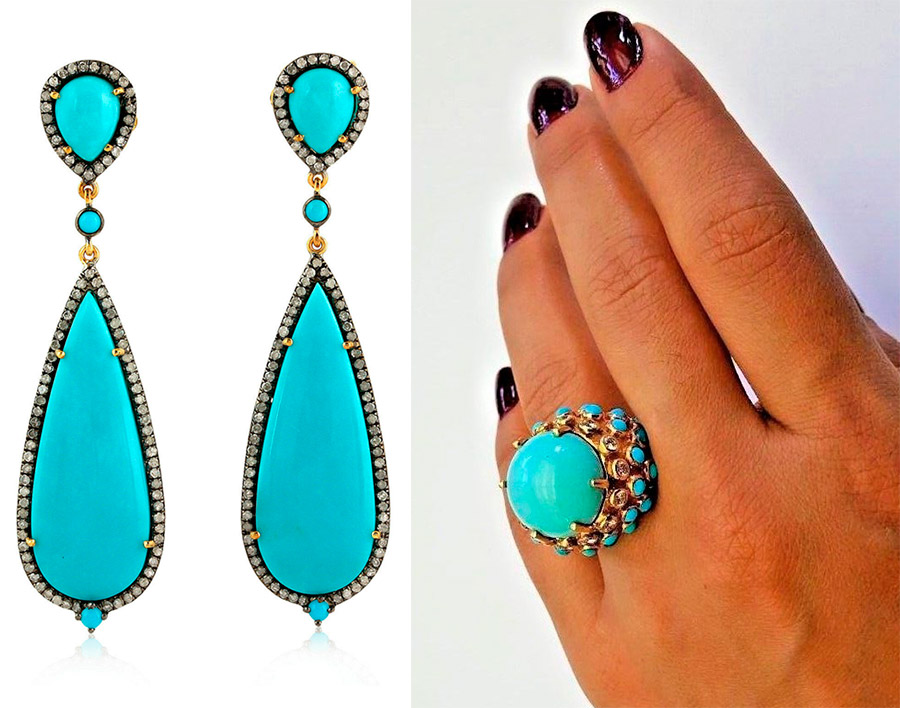 Pour les bijoux, la turquoise est taillée en cabochon. La surface est polie, donnant à la pierre un éclat doux. Le minéral est utilisé pour l'incrustation, les amulettes et la fabrication de bijoux. La pierre se marie bien avec l'argent et l'or, il existe souvent des produits où la turquoise orne le produit avec d'autres pierres précieuses, ainsi que des diamants.