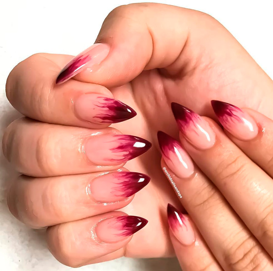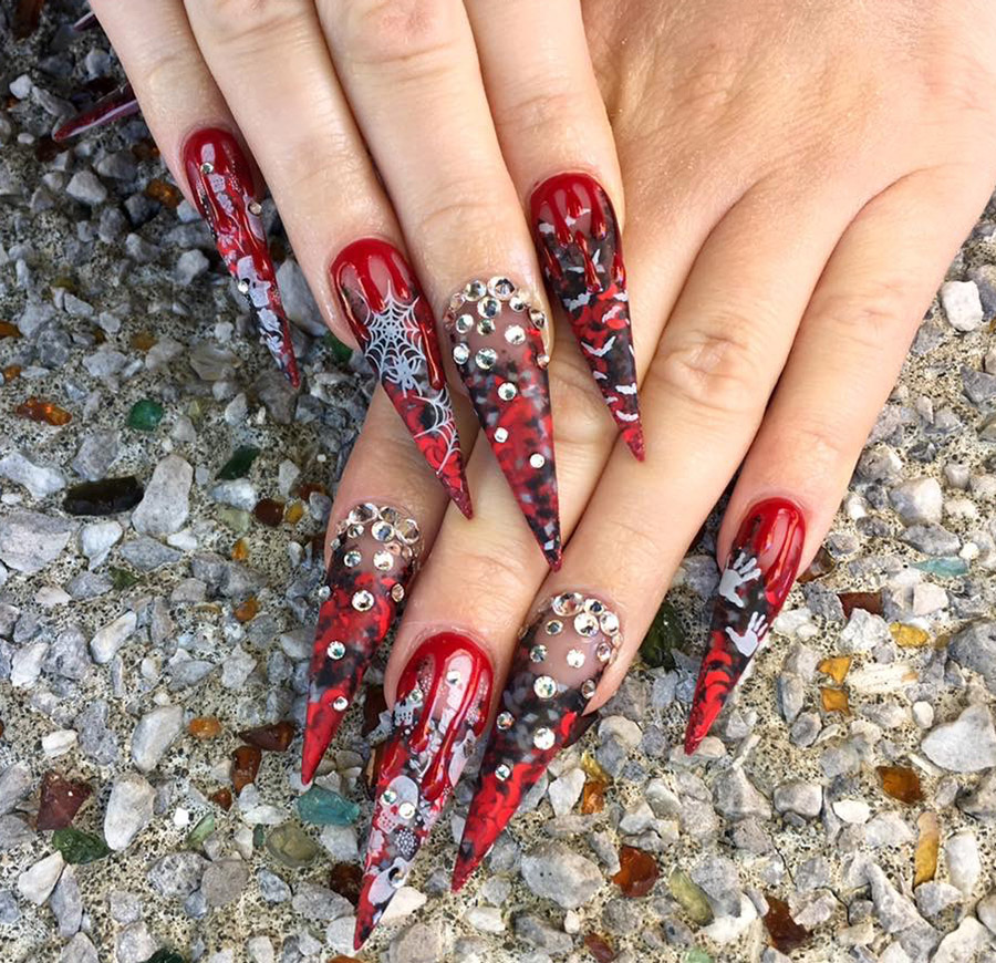 Les looks les plus effrayants et les plus agressifs nécessiteront plus de vernis. Rappelez-vous les films d'horreur, à quoi ressemblent les mains de zombies ? Ils sont couverts de sang ! Nous pouvons coller des ongles cassés et grignotés, les peindre avec désinvolture avec du vernis rouge et appliquer différentes nuances de vernis sur nos doigts pour obtenir un effet complètement laid.