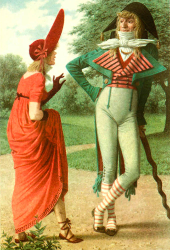 C'était la mode de l'aristocratie. Mais d'autres représentants des milieux bourgeois sont apparus, qui ont fui en exil pendant la révolution avec l'aristocratie. Les jeunes de cette classe se sont posés en victimes de la révolution. Ils ont créé leurs propres clubs, essayé de se démarquer du grand public. Ils ont été rejoints par les nouveaux riches (issus des classes inférieures), qui sont rapidement devenus riches pendant la révolution. On les appelait les nouveaux riches (du français nouveau riche - nouveau riche - nouvel homme riche).