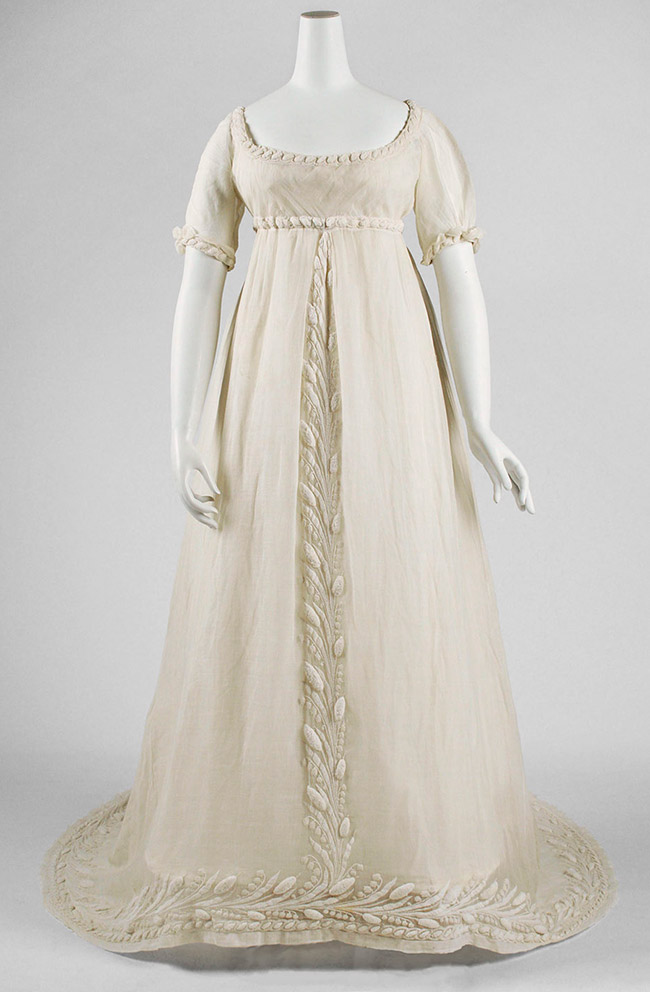 Textiles Shemiz - mousseline et batiste blanches, gaze et crêpe avec broderie au point bourdon blanc. Ces robes étaient en apesanteur, leur poids atteignait 200 à 300 g. Ils épousent parfaitement le corps des beautés, laissant le cou, les épaules et les bras nus. Parfois, fuyant le froid dans une robe si légère, les dames jetaient un foulard de dentelle sur leurs épaules.