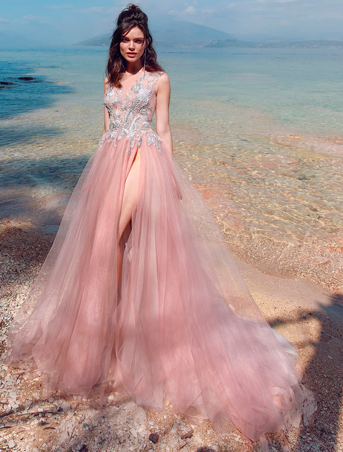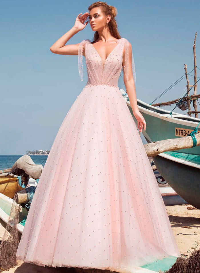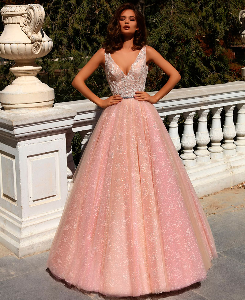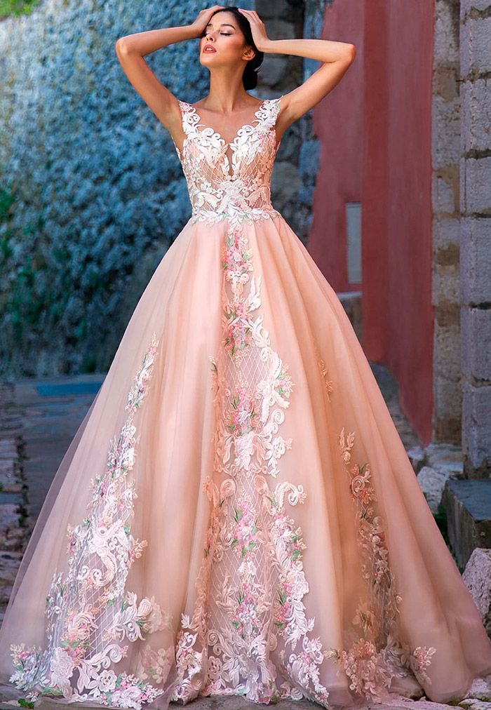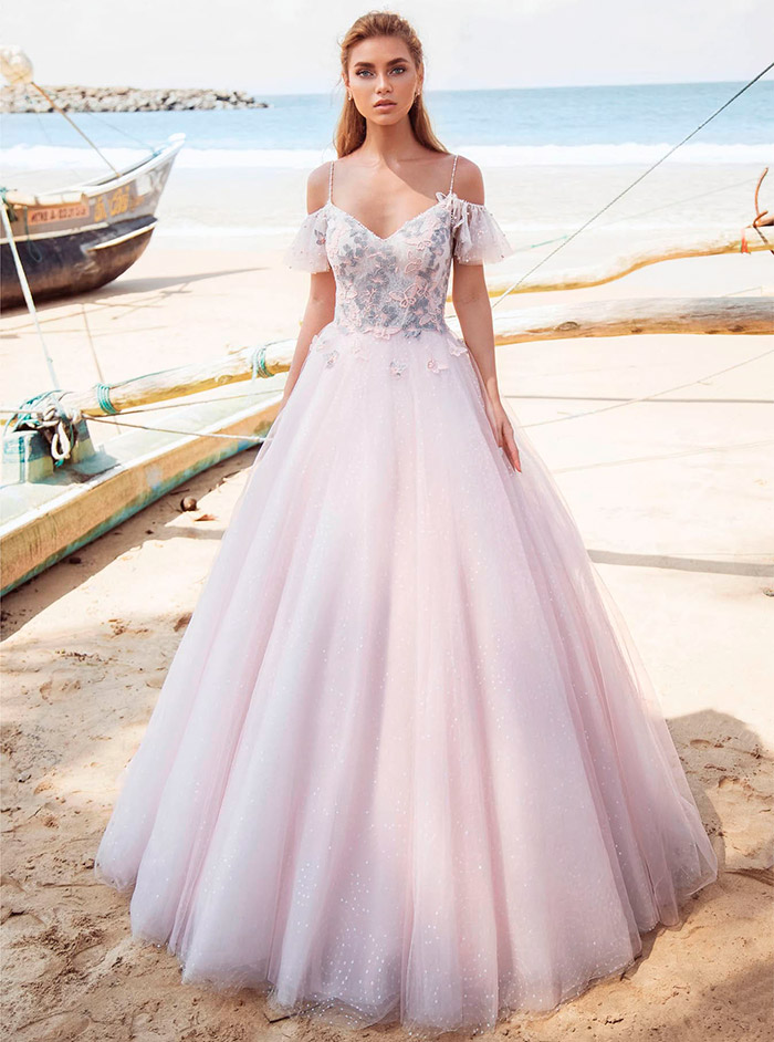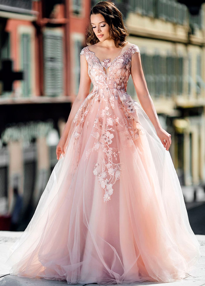 Il existe une infinité d'options pour le rose, mais toutes ne sont pas idéales pour un look de mariée. Les couleurs trop accrocheuses comme le fuchsia ou le cramoisi sont plutôt un choix pour une robe de soirée ou de cocktail. Mais les tons délicats présentent la beauté juvénile de la fille et rendent l'image de la mariée aérienne et féminine.